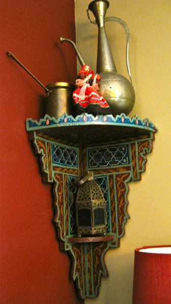 I have used a mixture of Spanish, Turkish, Egyptian and Moroccan accessories for our “Three Kings” table. This Moroccan mirror was purchased at World Market several years ago and goes with the shelf in the other corner. I had it upside down when I first got it then realized it should be this way.