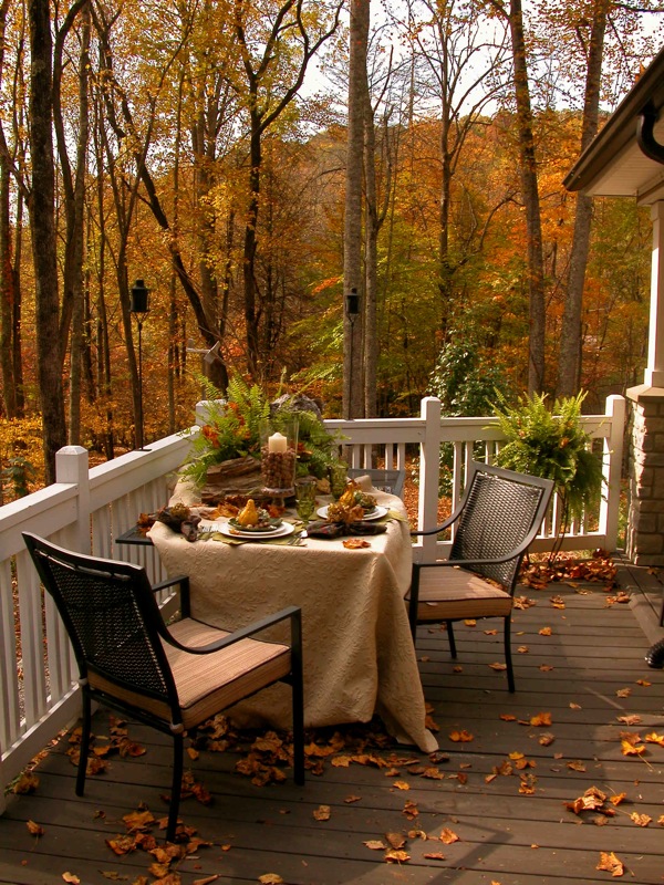 What beautiful table settings!!! I especially like the one out on the deck surrounded by all the yellow trees. So very breathtaking.