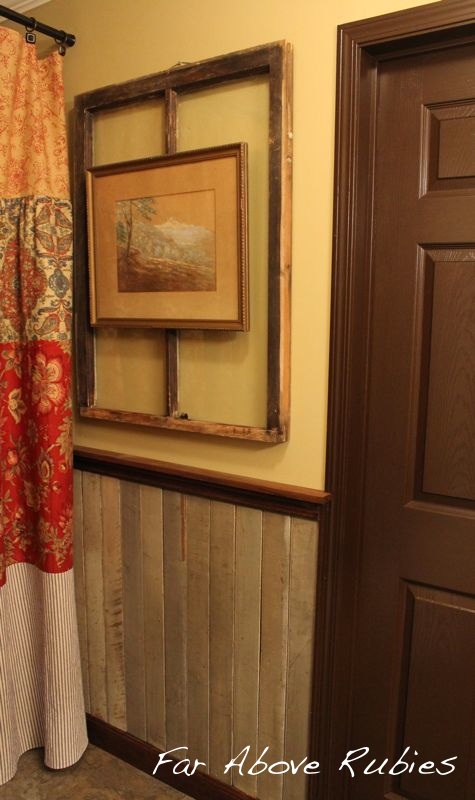 The reclaimed wood is wonderful! I love the look and the feel that it gives a room. How nice to have something out of your grandparents house, the window with the picture on top of it is very pretty. You must enjoy the time in that bathroom so much now.