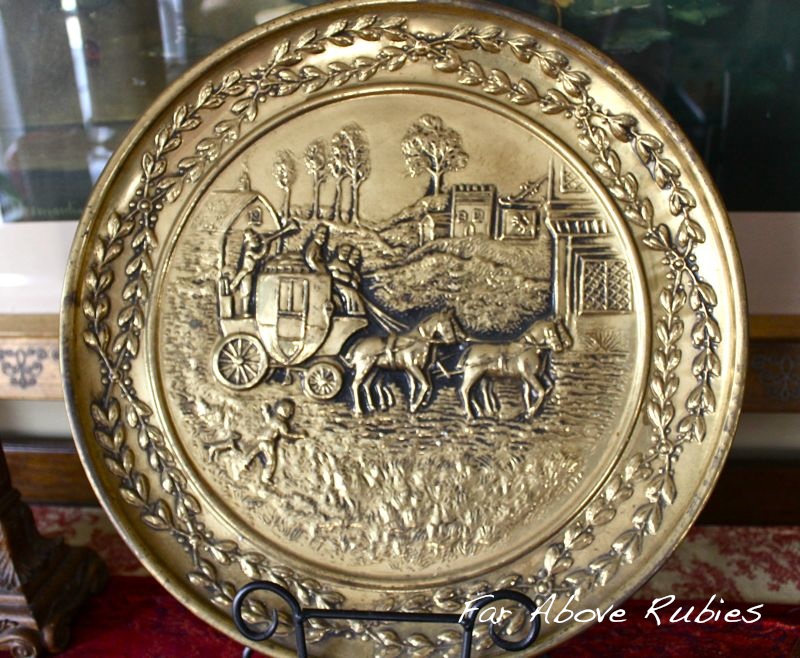 My mom had given me this brass-plated tin platter a while ago and I put it in the storage. Then, while watching an episode of “I Love Lucy” I noticed she had one in her Connecticut home on the mantle. Hmm. I remembered I had this one so I pulled it out. These were made in England so it does fit the English cottage style I have fallen into, but not sure where or how I will use it yet.