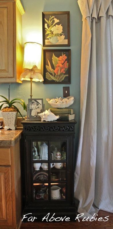I added some of my grandfather’s books, the feedsack lampshade, and some of her collectibles inside the cabinet.