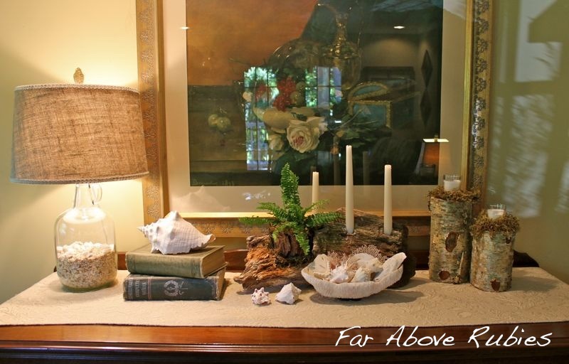 I love the old bottle lamp and your shell collection. It all comes together for a pretty summer look. Pamela