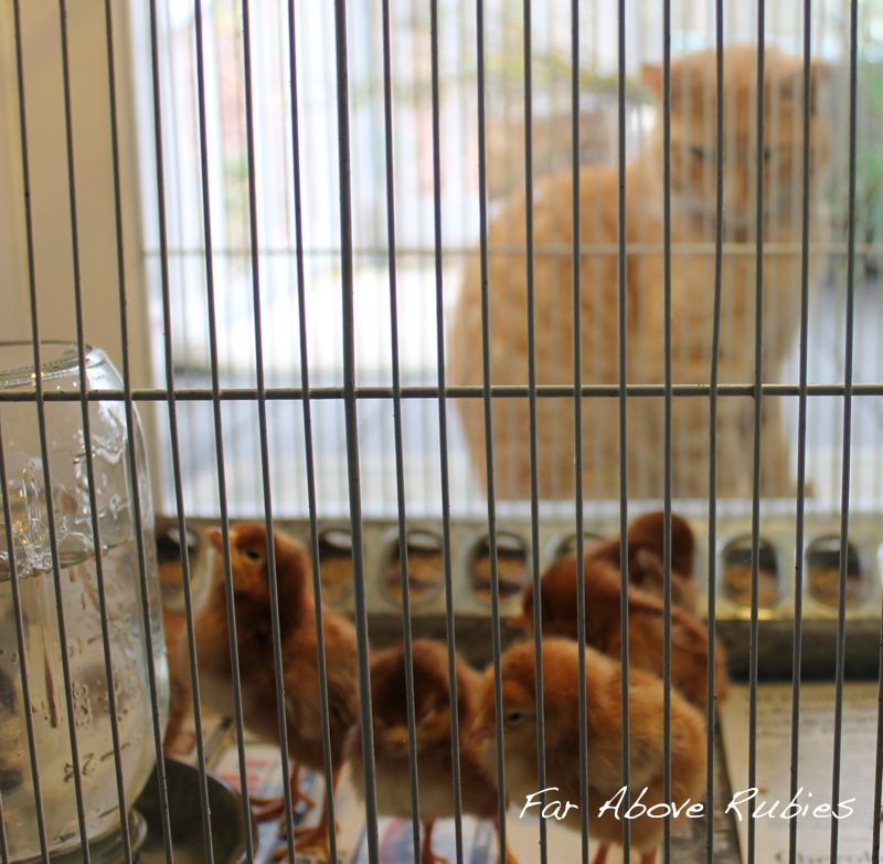 So we wholeheartedly embraced the chicks and moved them into the laundry room. Tiger the cat was not amused.