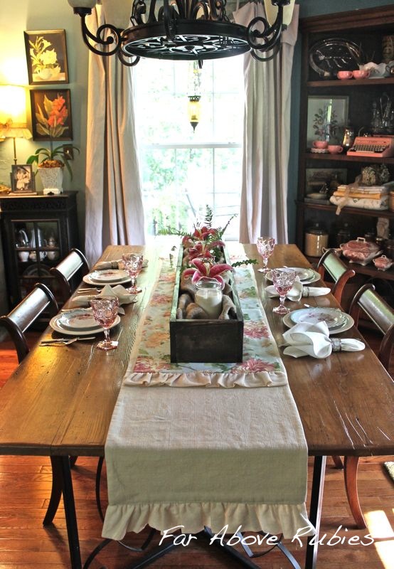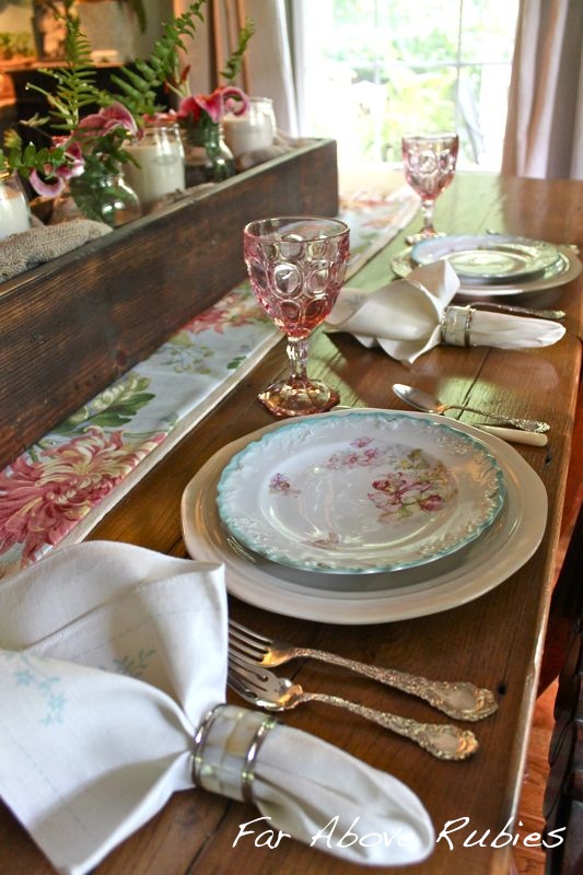 Hi Anita, I am sorry I missed this beautiful, genteel post. I adore the pink muted goblets and dishes and your Mother's amazing flowers. What a rich earth and talent for growing on your beloved lands. The runner is gorgeous. Soft shimmery golds, silver, white with dark evergreens would be lovely at holidays….:)I can only imagine your talent will produce.