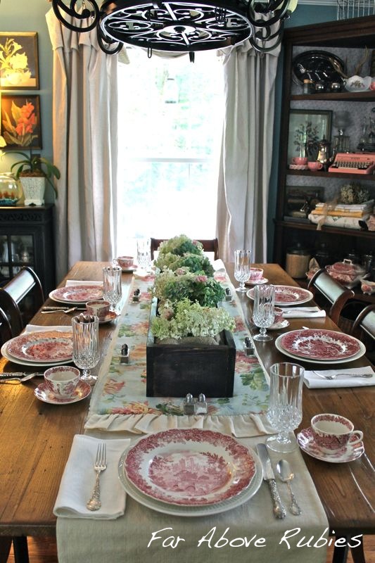 A totally lovely luncheon table. I love the centerpiece, the runner and of course, your gorgeous red transferware dishes! Beautiful everything.