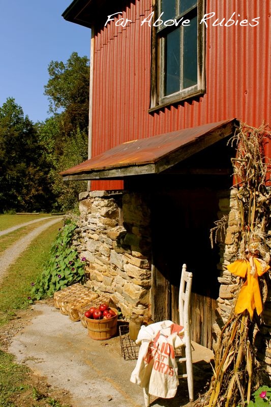 I was so excited to see your root cellar on Facebook and showed my husband. You see, we have a root cellar built into the side of a hill and half of it collapsed last year. All of that lovely yellow limestone rock tumbled down. Maybe after seeing your root cellar he'll tackle rebuilding it! We also have a smokehouse but I'm afraid it's built of concrete block, not nearly as charming as yours. I love your porch dressed for fall. Who would have thought of using an old bed frame or springs, whatever it is, and hanging old skillets from it? Very nice. Are apple pies baking yet?