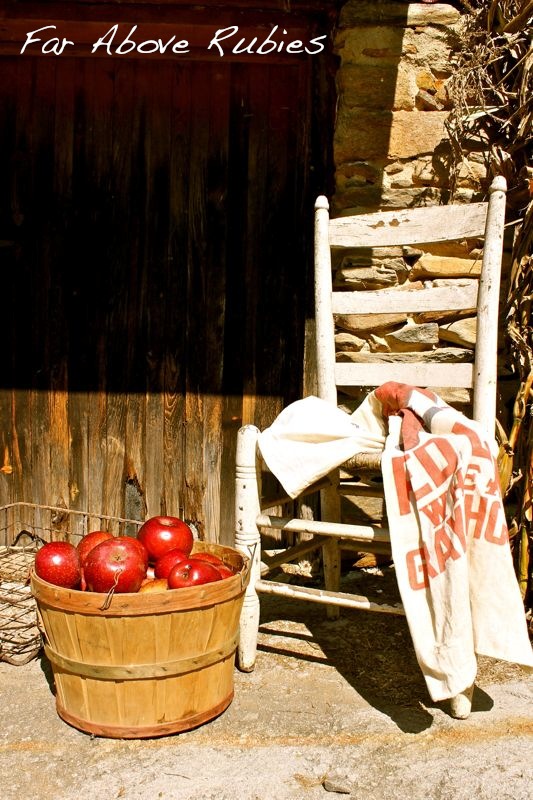 Great photos Anita. Love the apples in the basket, the grain sack and the old chair. I always love the red chippy paint door too. Your porch is looking good. The ferns are an unexpected by nice combination with the ferns.