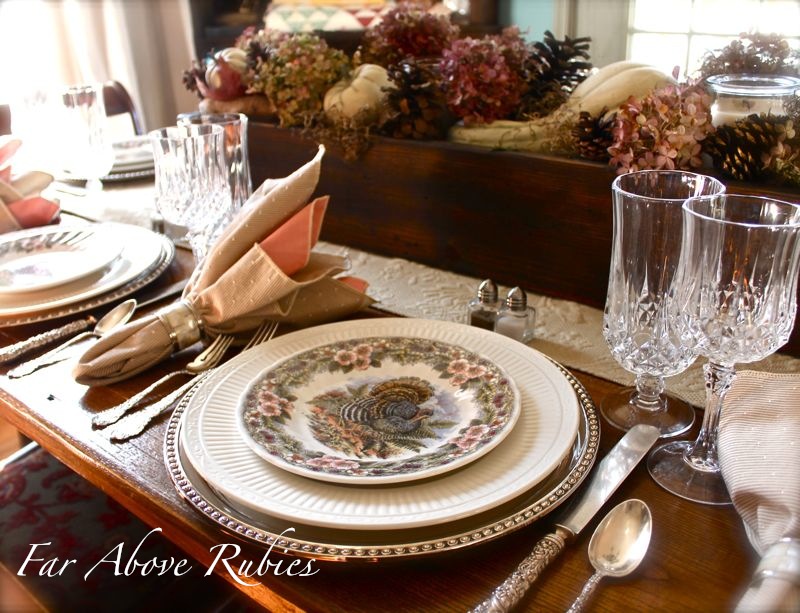 I used the same turkey plates I always use…Queen’s Myott Thanksgiving by Churchill. I love these especially for the soft, muted colors. I am using a Mikasa “Italian Countryside” dinner plate and a silver charger.