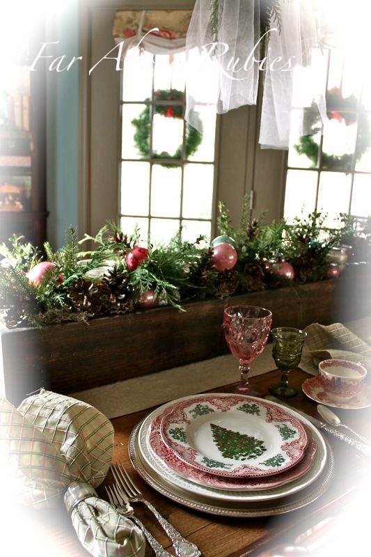 I LOVE the colors you have used, it is so romantic and pretty! The dishes are beautiful along with the glassware. The silverware is GORGEOUS!!! I love the little tree and the BENCH! Have a wonderful Christmas, Anita! XO, Pinky