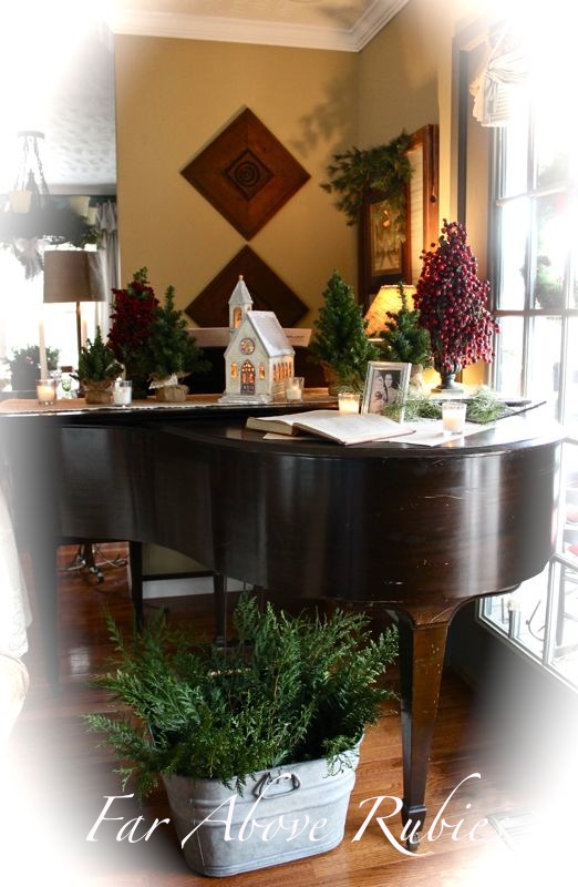 I love your all American vintage Christmas theme. Love the old lighted church, the arborvitae in the tub, and the piano photos. Lovely as always.