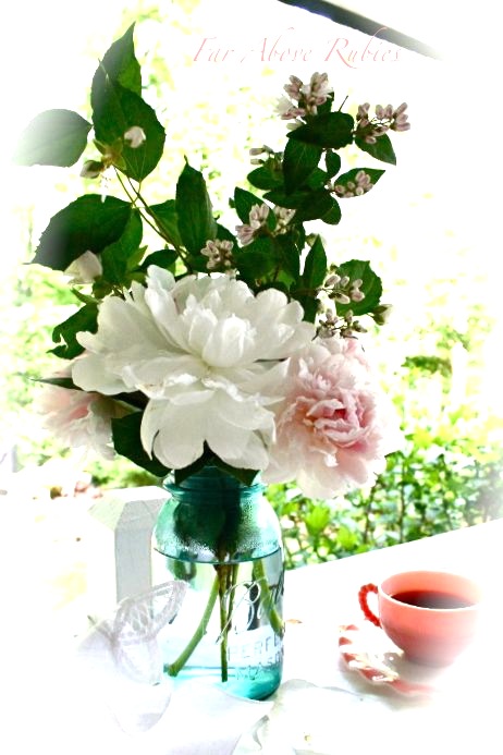 I found this old Coke carrier a while back so I put my mother’s peonies in Coke bottles.