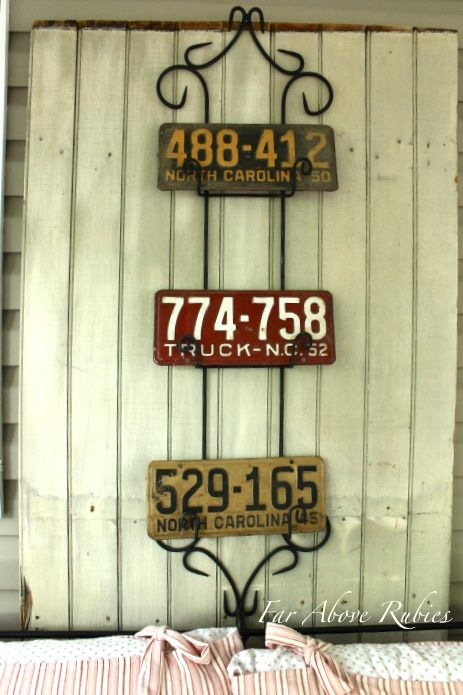Your porch is so inviting! The vintage details and soft colours speak of relaxing times – no wonder your family enjoys sitting out there talking. The license plates look perfect in your plate rack and the screen door adds an unexpected element that adds to the charm.