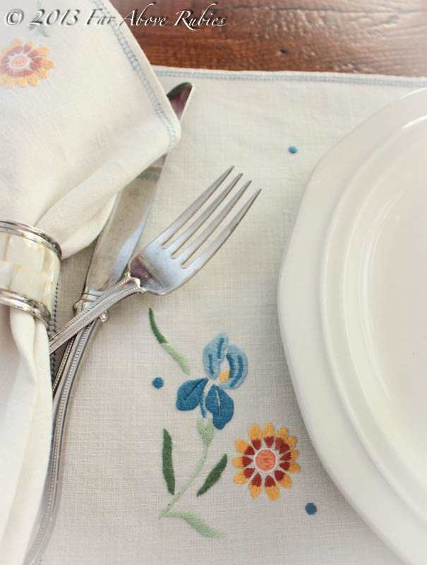 I love to use the vintage linens that were passed down to me from a cousin of my grandfather’s. She was such a cultured southern lady and had the most fabulous things. My mom just gave me this beautiful set of embroidered linen placemats and napkins.