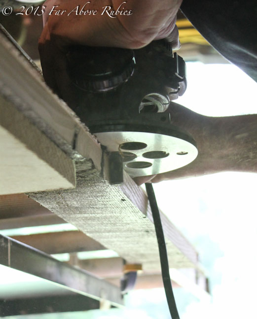 He made the first pass with the router, but you can see the bit was not long enough to get the complete width of the wood, so he had to make several passes and adjust the length of the bit to cut the entire edge.