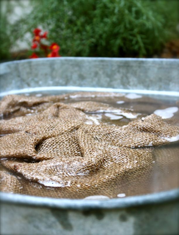 I really got started late playing with burlap, but really do love it for projects. I washed it for the first time outdoors in a galvanized wash tub, but I noticed how wrinkled it got and difficult to iron, so I wash it in the washing machine now and dry just a bit in the dryer, then hang dry. It is not easy to iron, but my mother gave me Rowenta professional steam iron, and that really does a great job.