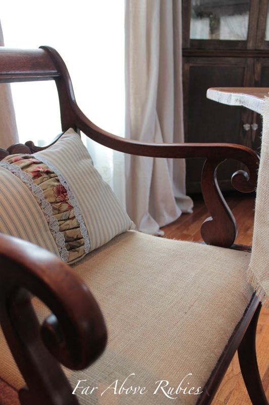 I am in love with burlap. I never even knew you could prewash it until recently! Yes, I said "duh" right out loud. I'm planning to cover some kitchen chairs with it as soon as I have a pair of minutes to do it. I love yours.