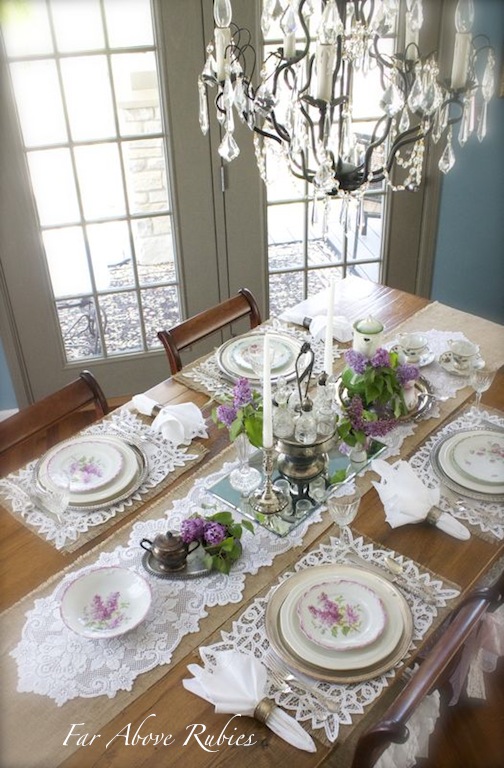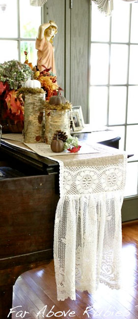 You have become very creative with burlap, Anita. I do love the screen door in your kitchen and all your fabulous runners etc. The lace trim really softens the look on the runners, placemats and chair covers. Very pretty! I don't have anything burlap in my house but I enjoy seeing what others do with it. Pam