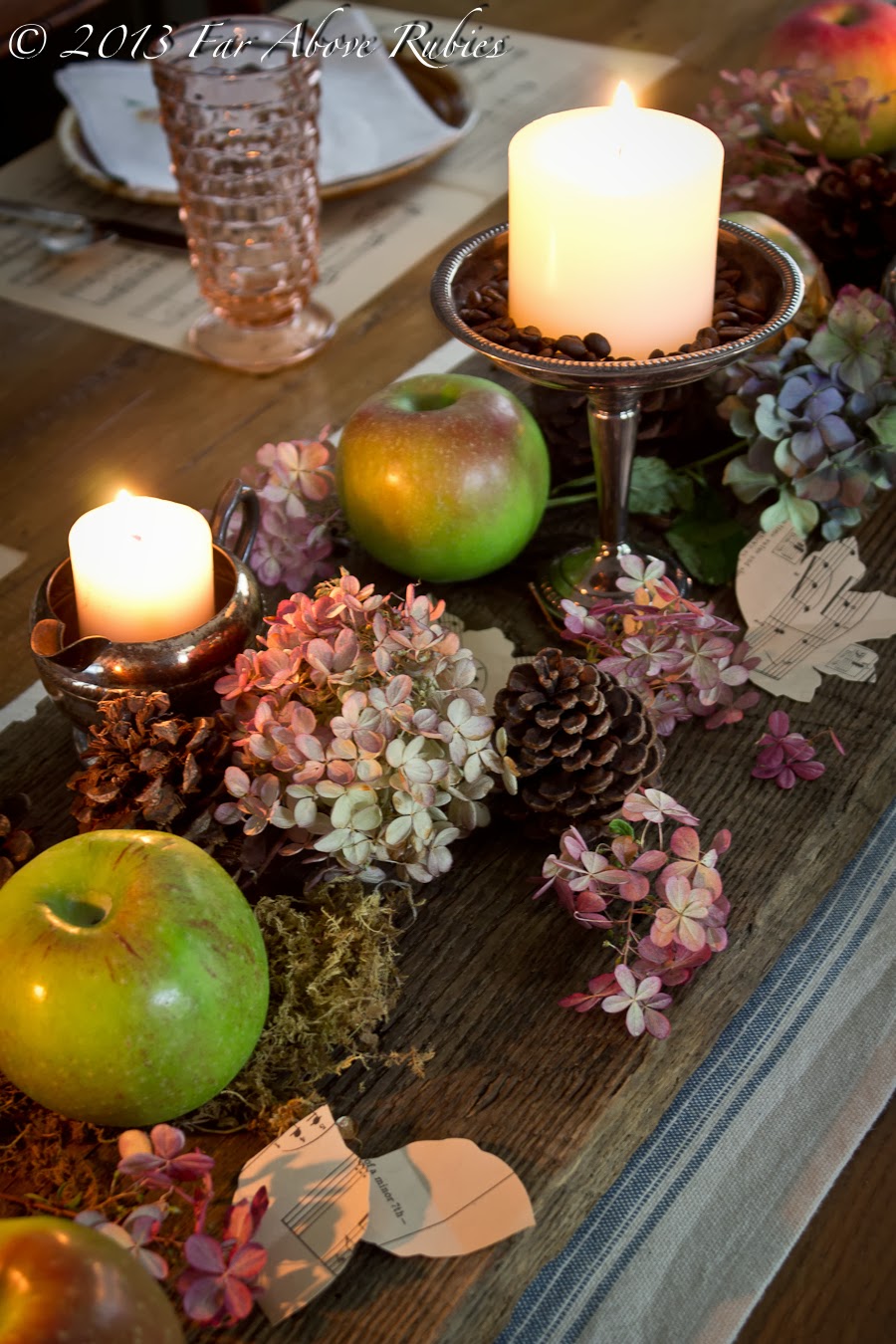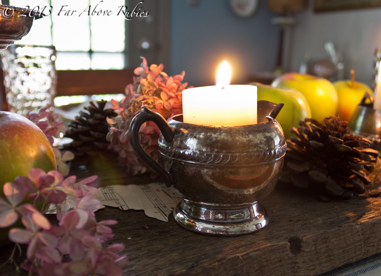 Anita, love the rustic with elegant silver. The candles and apples and music sheets are wonderful together. Everything in your table top is gorgeous.