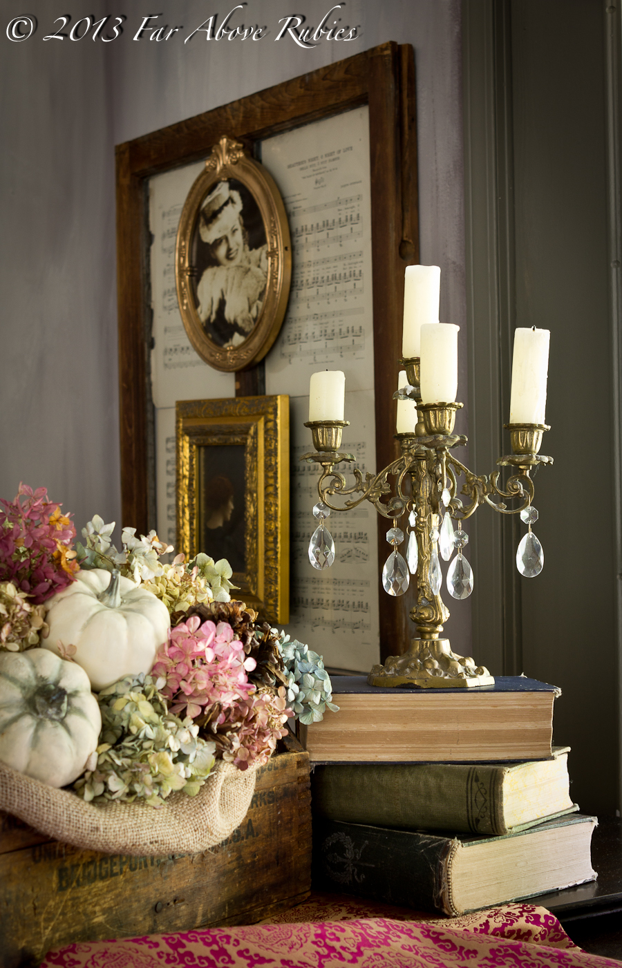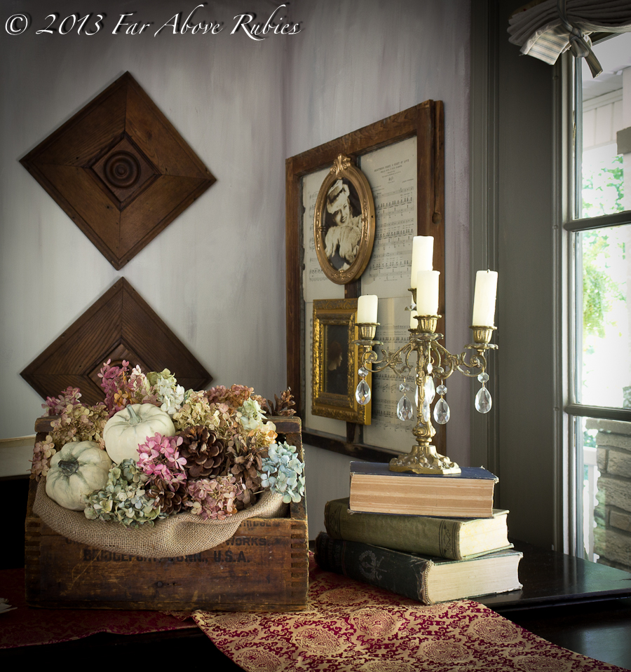 Gorgeous vignette!! You have the most beautiful colors of dried hydrangeas.