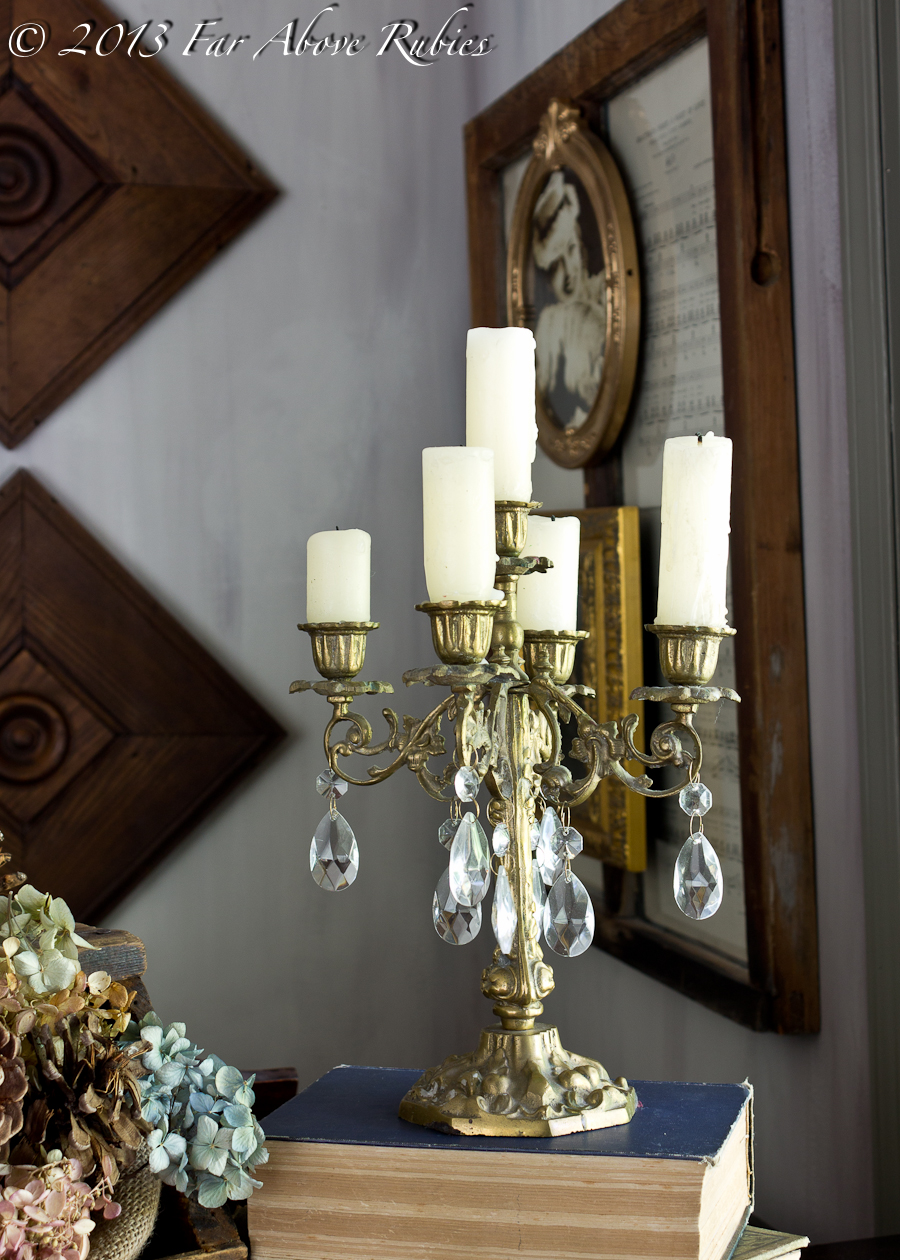 I added crystals and chunky candles in different heights to the brass candelabrum my mother brought from Lebanon.