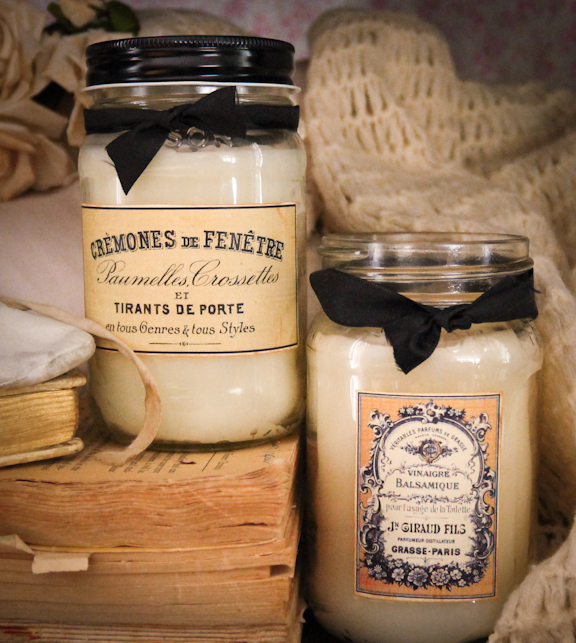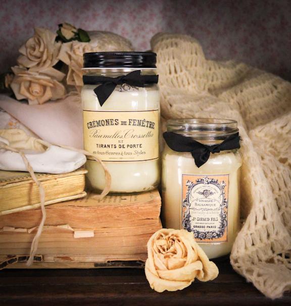 The 16 ounce jar candles are made with her own clean-burning paraffin soy wax blend and scented to the maximum, then hand-poured into thick glass mason jars. She also makes the beautiful labels using her own collection of vintage cards and postcards.