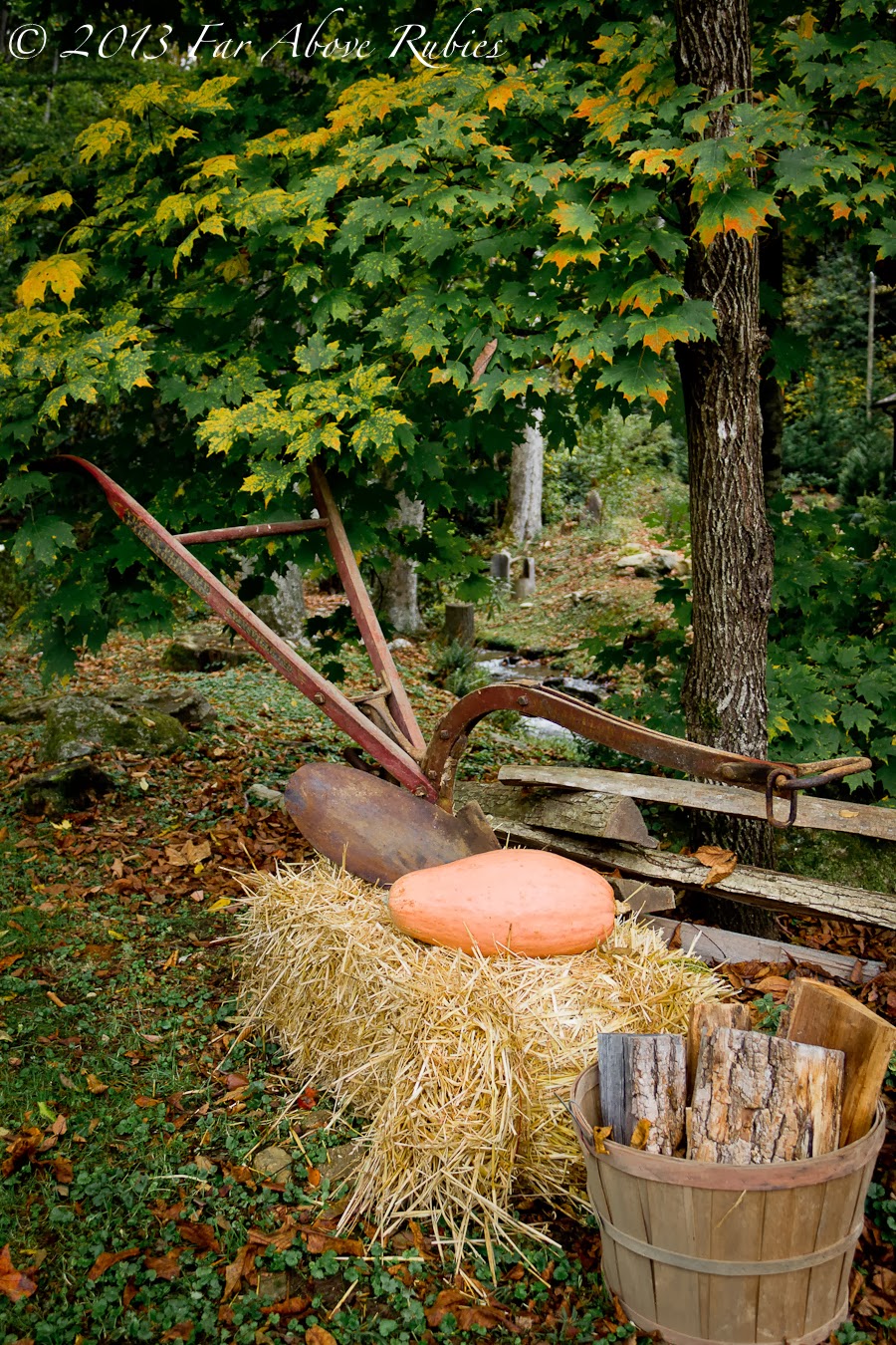 I *had* to add some corn stalks and a scarecrow along with this antique hand plow:-)