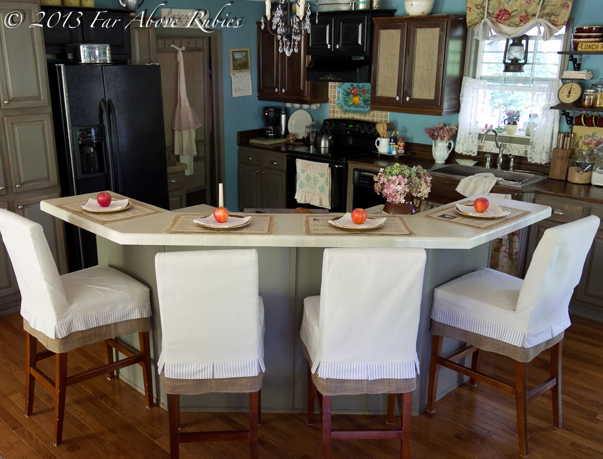 I also made slipcovers for the counter chairs, and freshened up the finish on the cabinets, but I”ll tell you about that later.