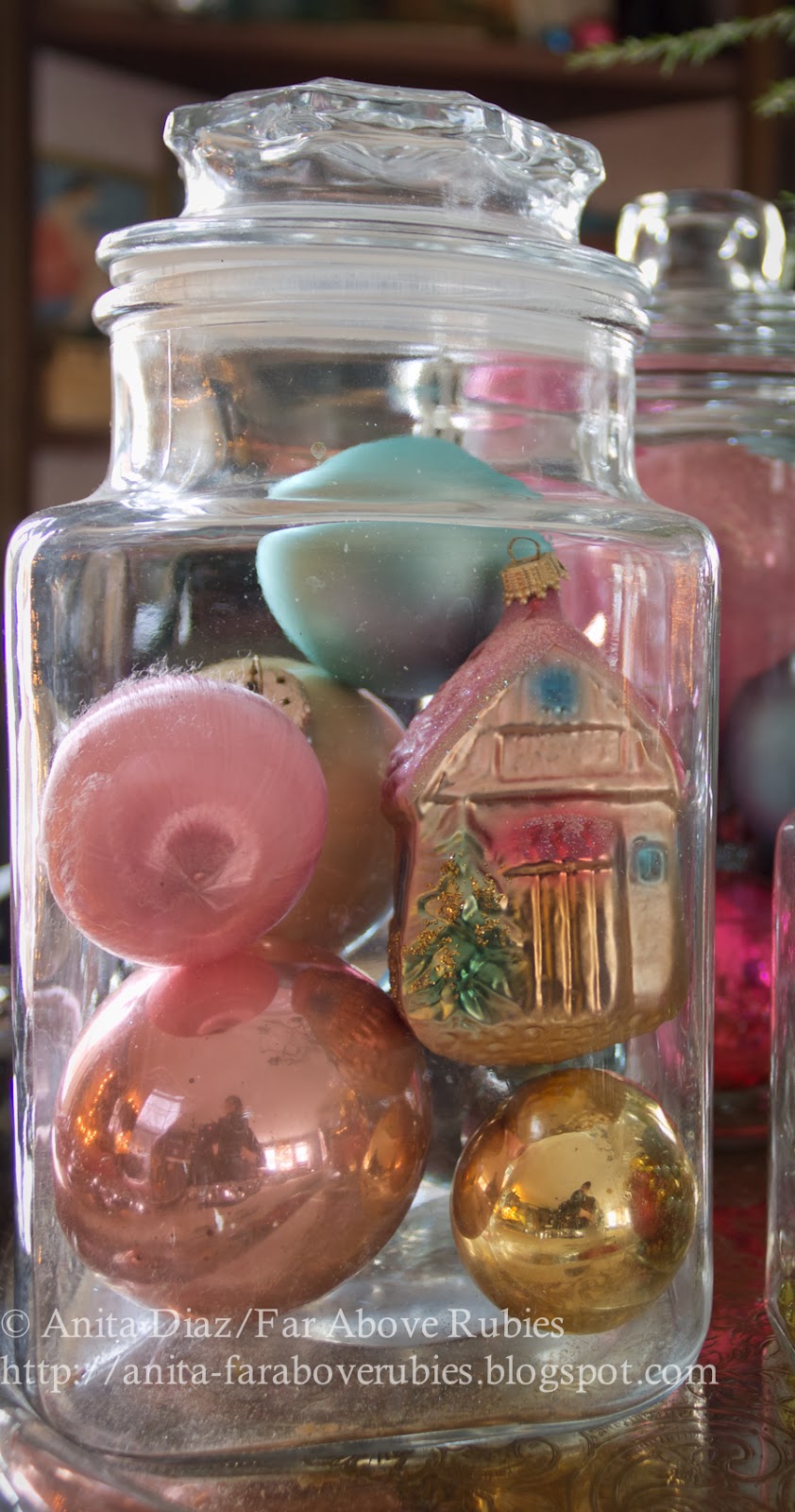 It looks very pretty, Anita. I love your little tree in the old bucket and the glass jars of vintage ornaments. It's a very busy time of year. Enjoy it!