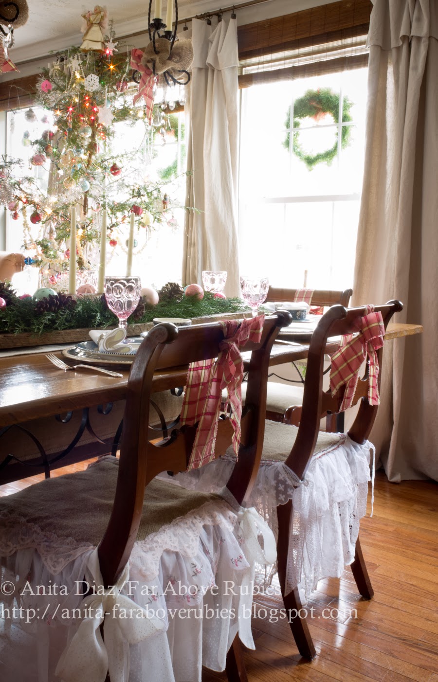 What a wonderful Christmas atmosphere you've created. Love your scraggly tree and the replica of your father's home place that you made. Your table looks wonderful- love the centerpiece and how the chairs are dressed out. You have put a lot of love into your Christmas decorating and it looks wonderful.