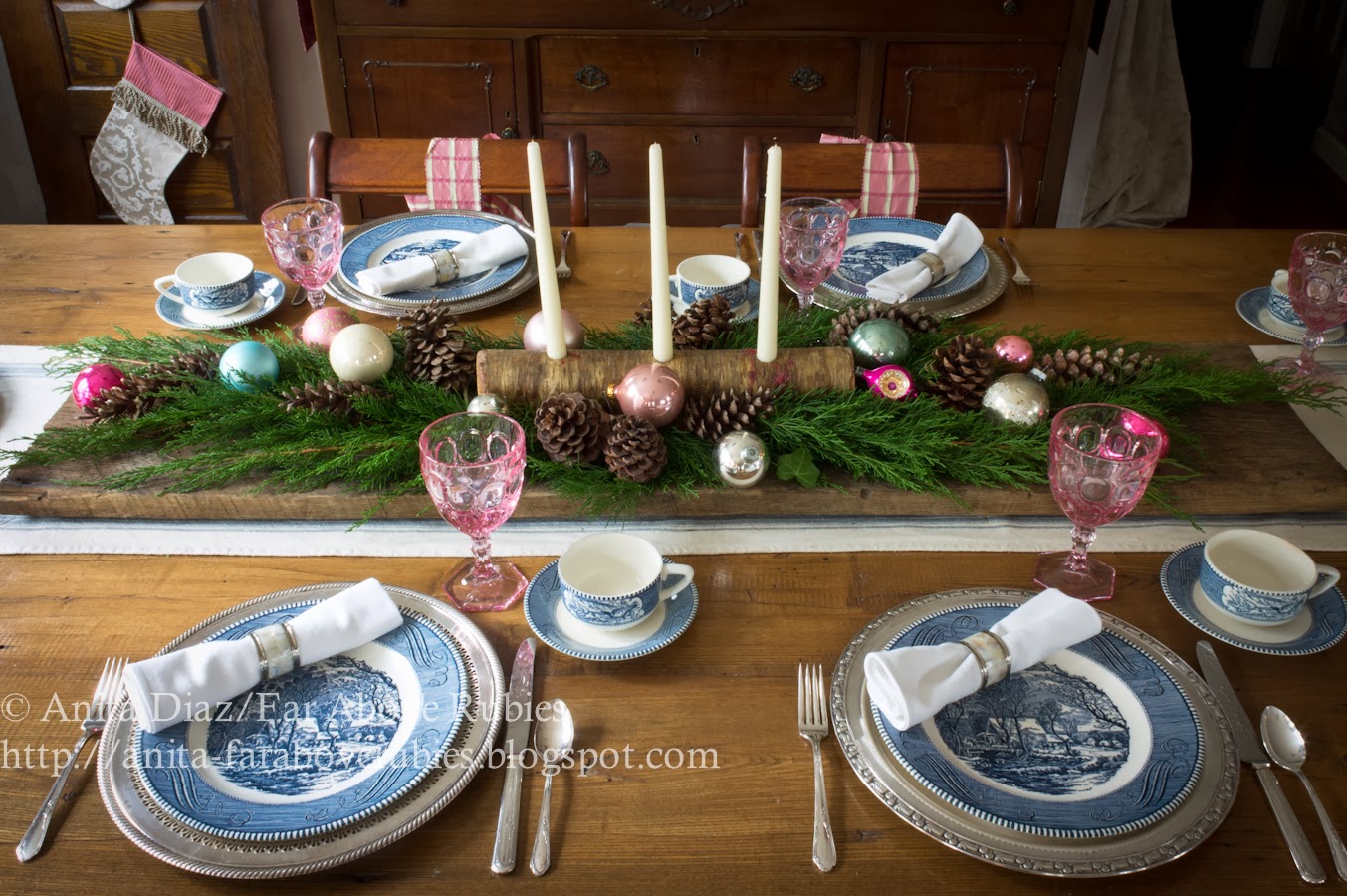 Currier and Ives dinnerware from the 1950s, my grandmother’s yule log and vintage Shiny Brites…