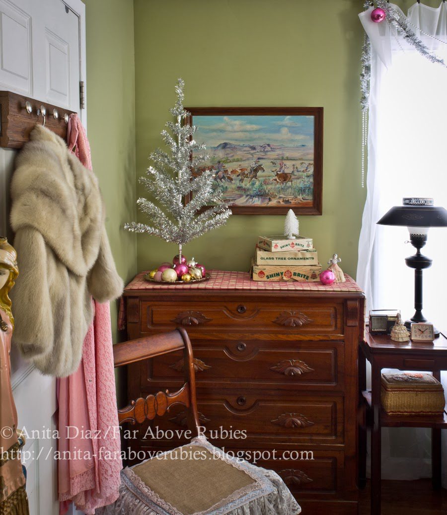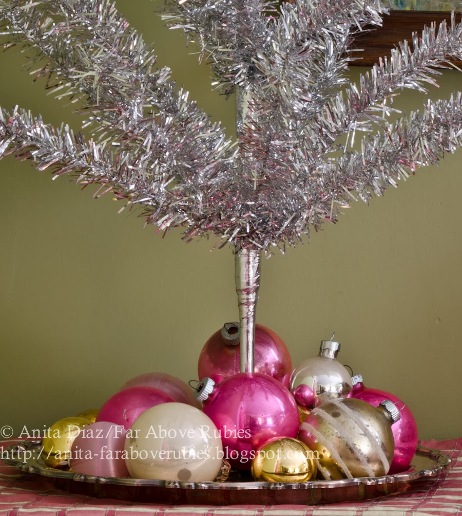 Sorry I'm so long in reading. These decorations are exactly what I'd love to have in my pink room. Love the aluminum tree on the silver tray and the simple pink ball on the silver compote. I am now in search of some vintage ornaments for next year! thanks for the inspiration.