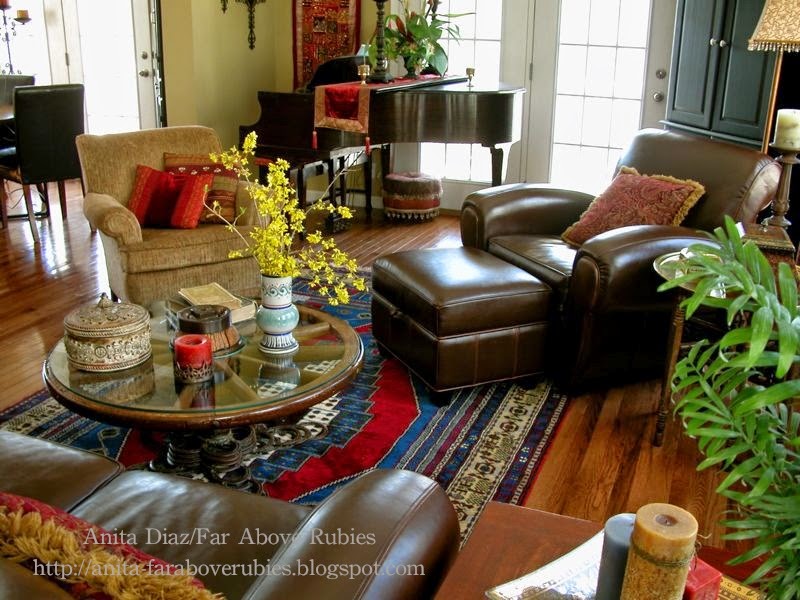 Then I started moving things around, like I always do. I had dark brown leather furniture because I had young children. Funny enough, I had white slipcovered and white painted furniture for years before going with the brown leather and a more Mediterranean feel — including things I had collected on my travels like this rug I bought in Turkey.