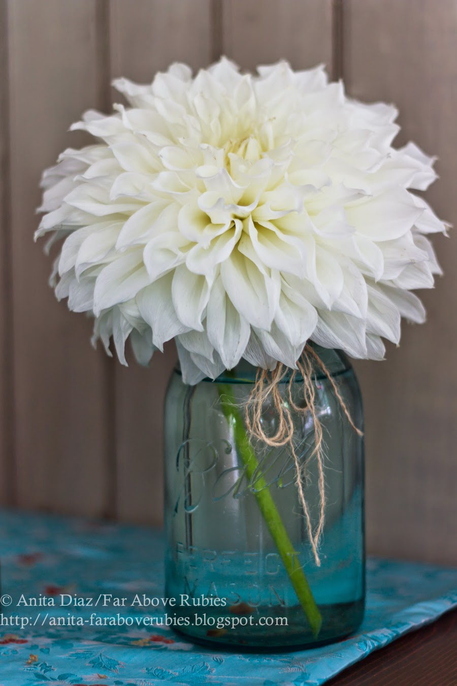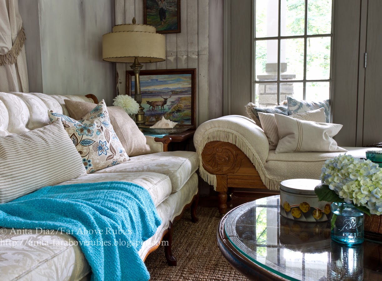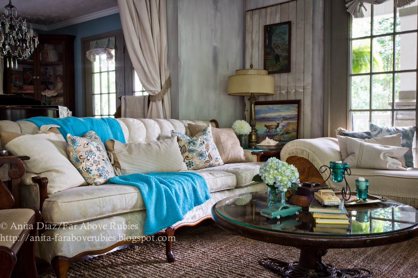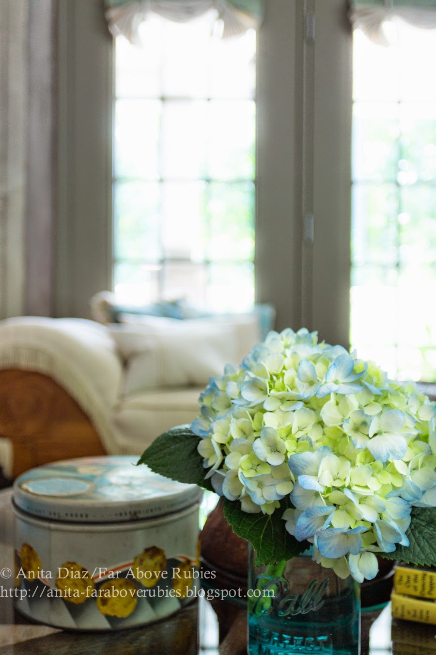 Everything is beautiful and the pop of blue is just right! I use blue alot! I so much enjoying your blog and fine every detail perfect. The photos are so great! I'm crazy about aqua canning jars, Ball or Mason or Atlas, doesn't matter one bit. They have the new ones now, but I prefer knowing that something was used in yesterdays.