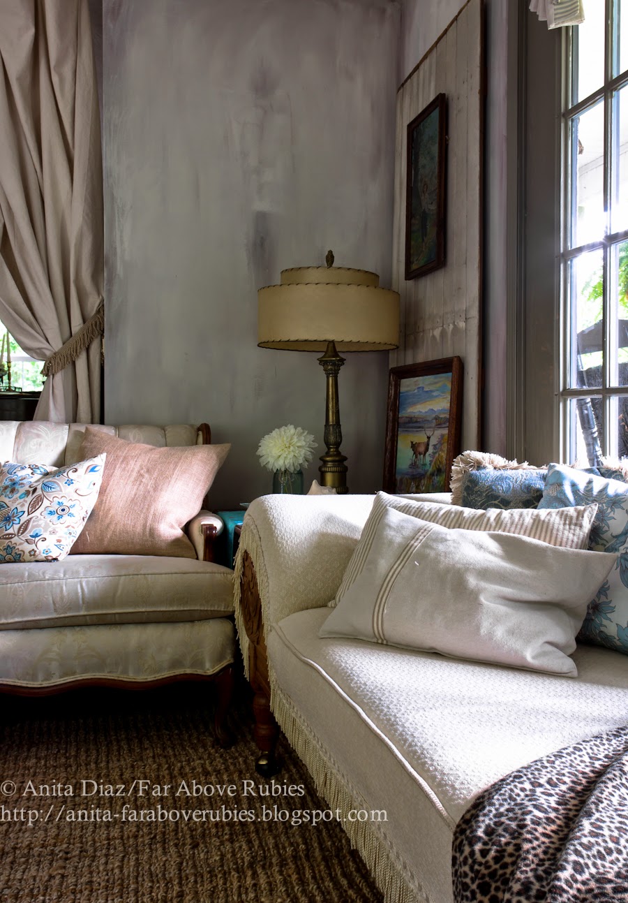 I wanted to do something totally off the wall, so to speak, in this corner so I took the art off one wall and just propped it against the old door. I am quite sure I’m the *only* person who likes this look, but I was inspired by a scene in Gone with the Wind when they are back at Tara after the war starts and everything is gone but a few objects. The walls have this same look — like there was art there but it has been taken away. That look fascinates me because it makes one wonder what was there. And it’s different:-) Ok, enough about that.