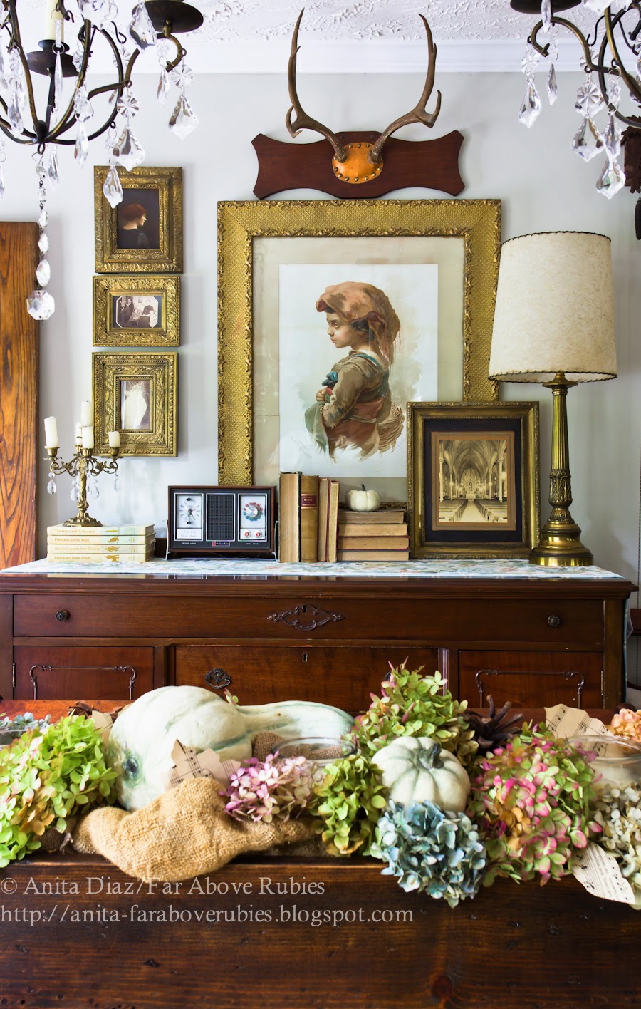 I decided to add hydrangeas, pine cones, candles and the white pumpkins I painted a couple years ago.