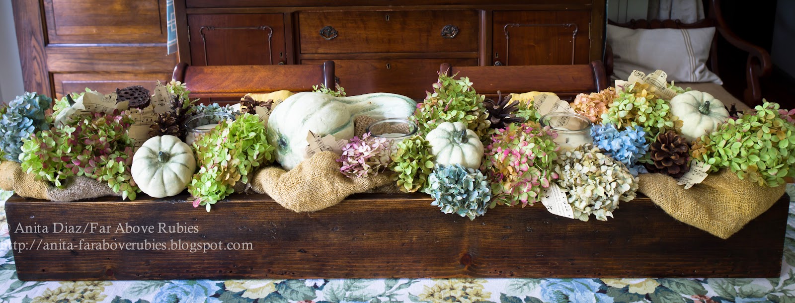 I remember this beautiful box! And it looks absolutely lovely this fall with the pretty hydrangeas and fabric. So creative! And I love the sheet music place mats! I agree, fall can be so fleeting and my favorite thing to do is bring the outdoors in!