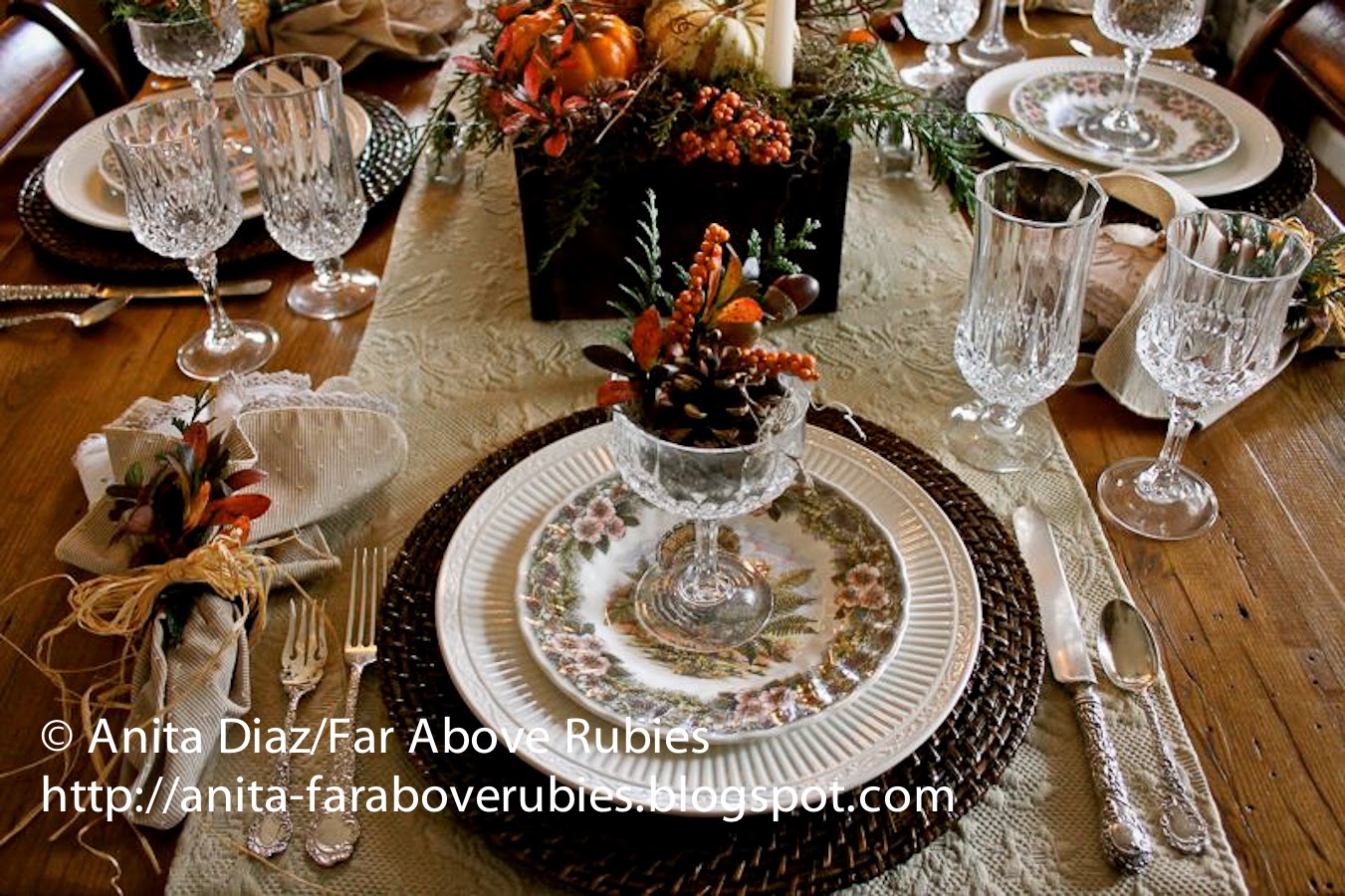Here, Mikasa “Italian Countryside” is paired with Churchill “Thanksgiving” salad plates, 1896 Wallace “Louvre” sterling flatware and Durand Cristal D’Arques “Longchamp” crystal. The rattan chargers were from Walmart, and I stained them with dark walnut stain.
