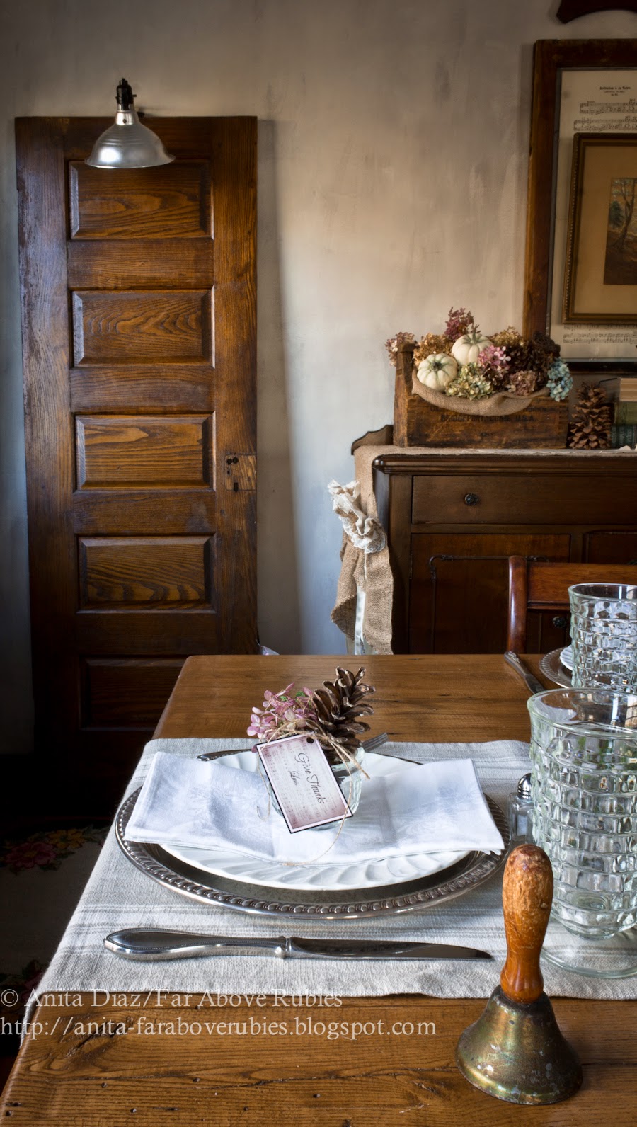 Last year for the centerpiece, I used an old wood board with hydrangeas, cedar, white painted pumpkins and old silver, including my great grandfather’s Aladdin-style oil lamp.