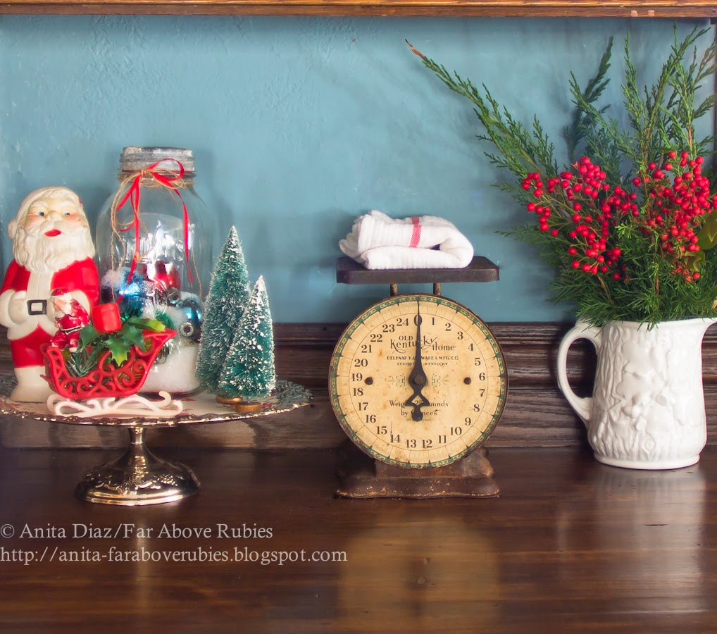 The Santa with sleigh is from my childhood and although he is missing his reindeer, I still love him. The plastic Santa belonged to my grandmother and I just added vintage Shiny Brites and “snow” to the Mason jar.