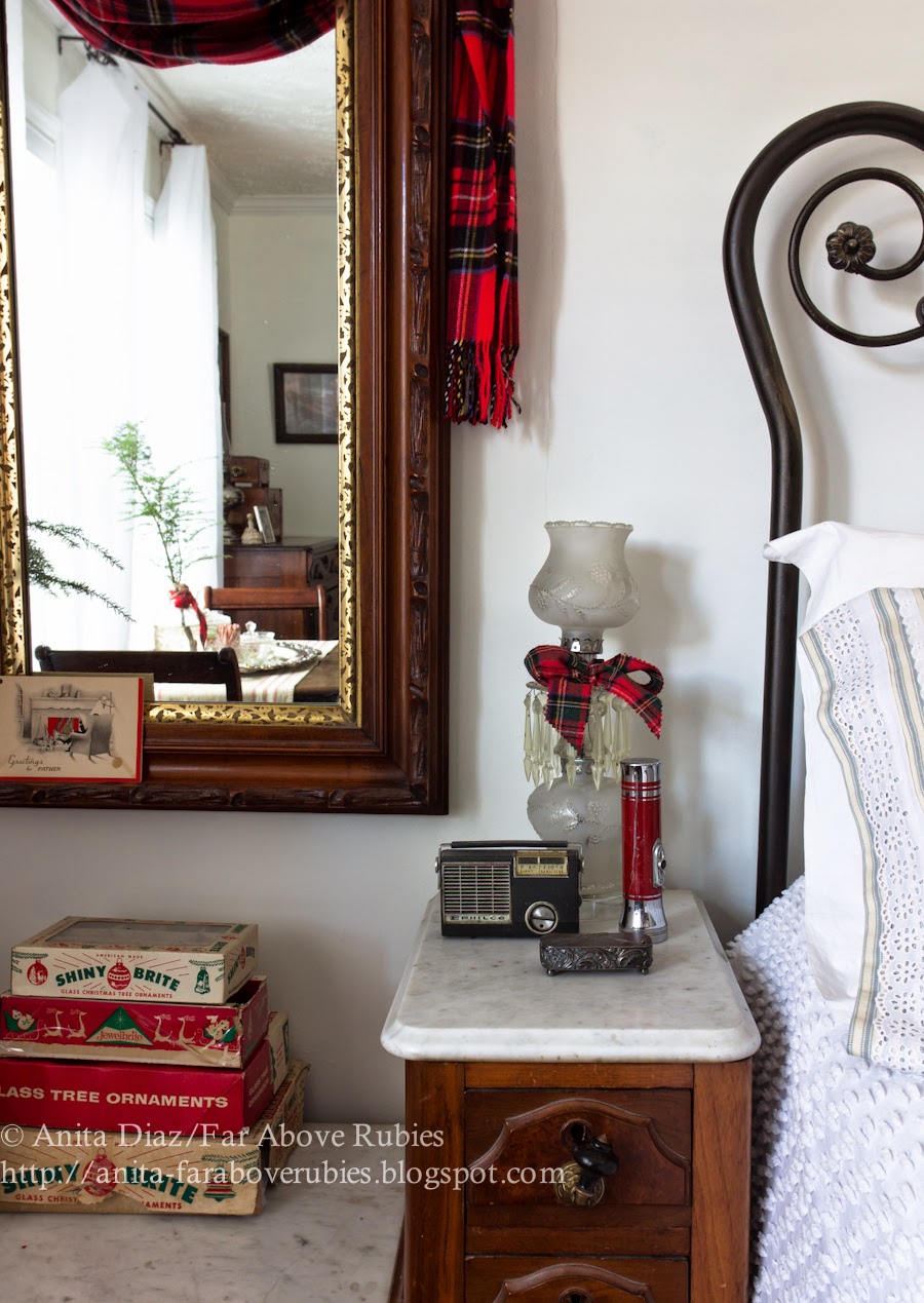I draped a Scottish cashmere scarf across the mirror, and left a few vintage ornament boxes on the dresser.