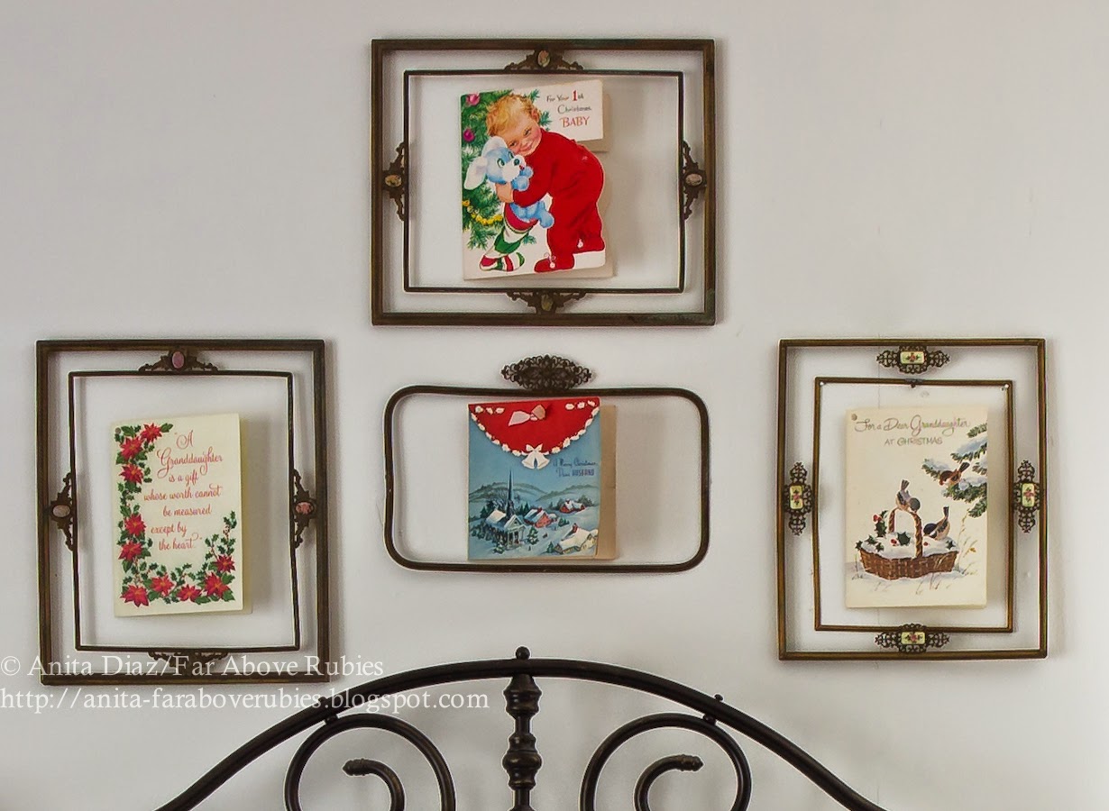 A neighbor gave me the metal frames, so I placed vintage Christmas cards in them, including one my grandparents sent for my first birthday.