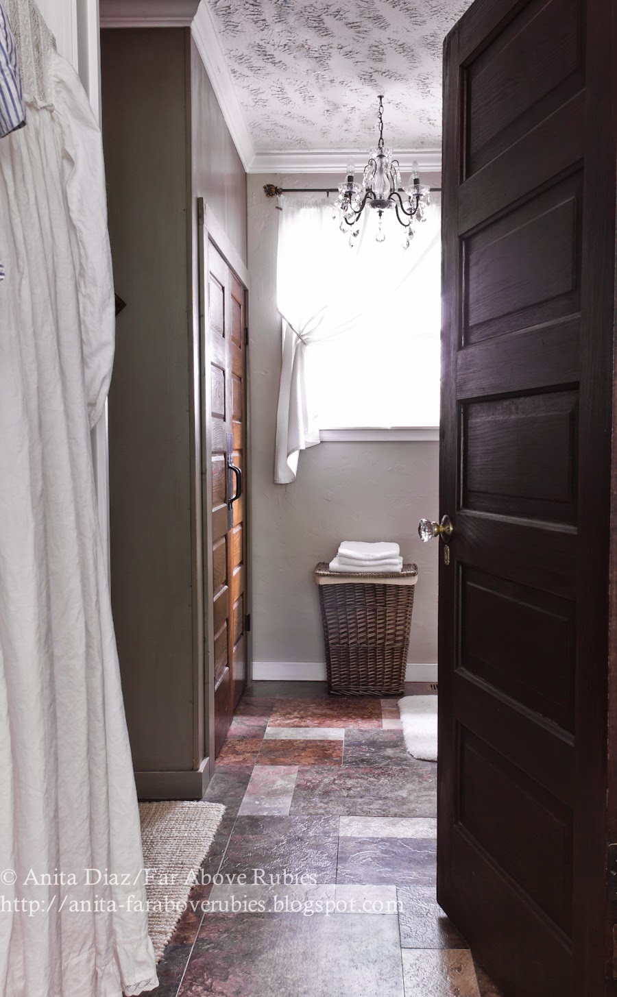 We were not able to replace the floors or countertop, but had to make do with what we have. I would have loved white quartz counters and a marble-tiled floor and shower, but that is just a dream:-)
