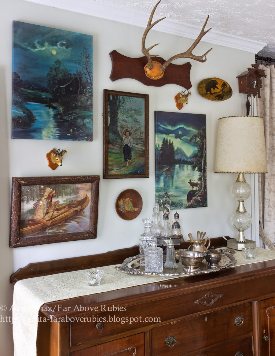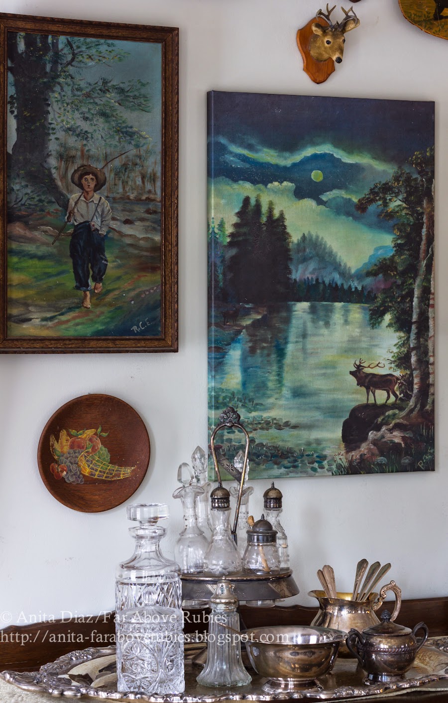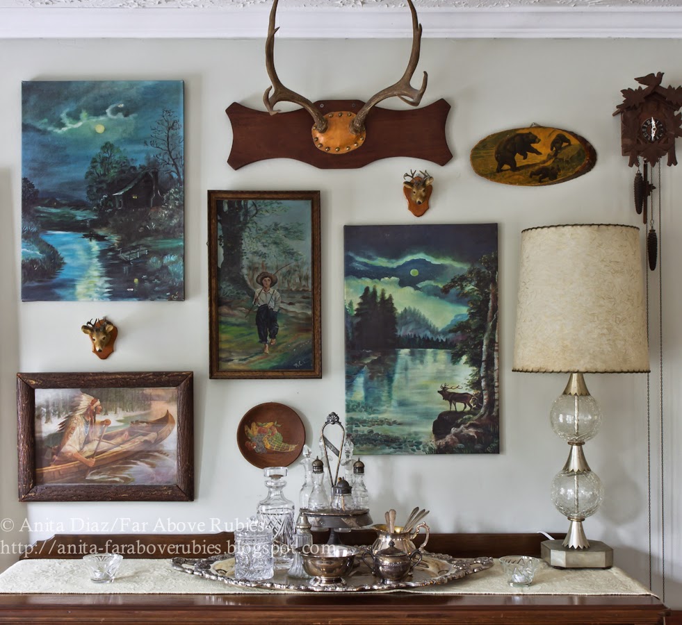 I love the old vintage landscapes — I collect them and use them in a collage in our lake cottage. Your addition of the deer heads is perfect with them, and, certainly, the fact that they were painted by a family member makes them even more special. I love your arrangement!