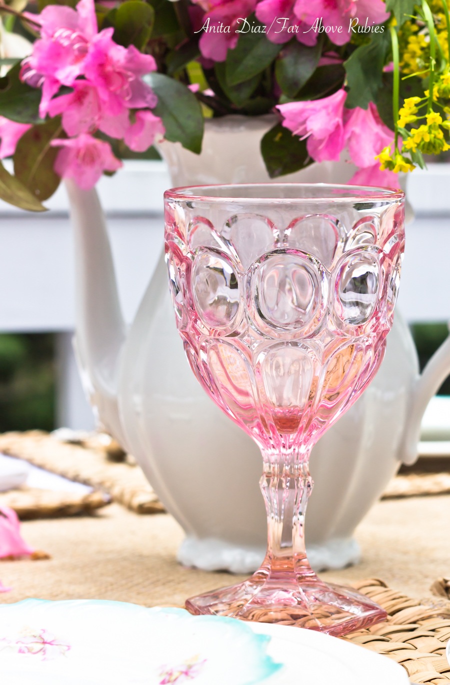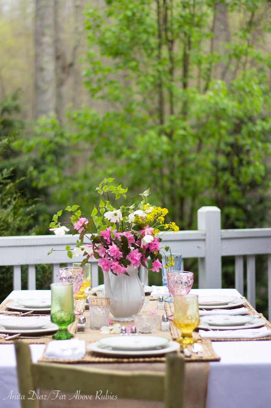 Your outdoor table setting is absolutely gorgeous, Anita!! Love, love, love all the pretty pastels you mixed in the flowers, plates, seating, goblets…perfectly lovely!!