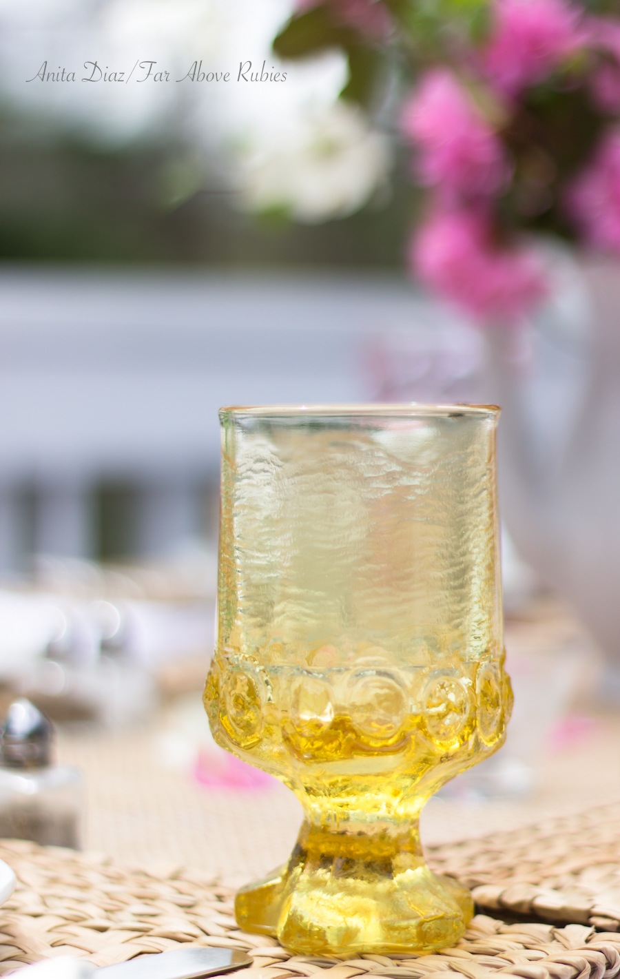The Fostoria “Moonstone” goblets were a gift to my daughter from my mother, and are a beautifully soft shade of pink.