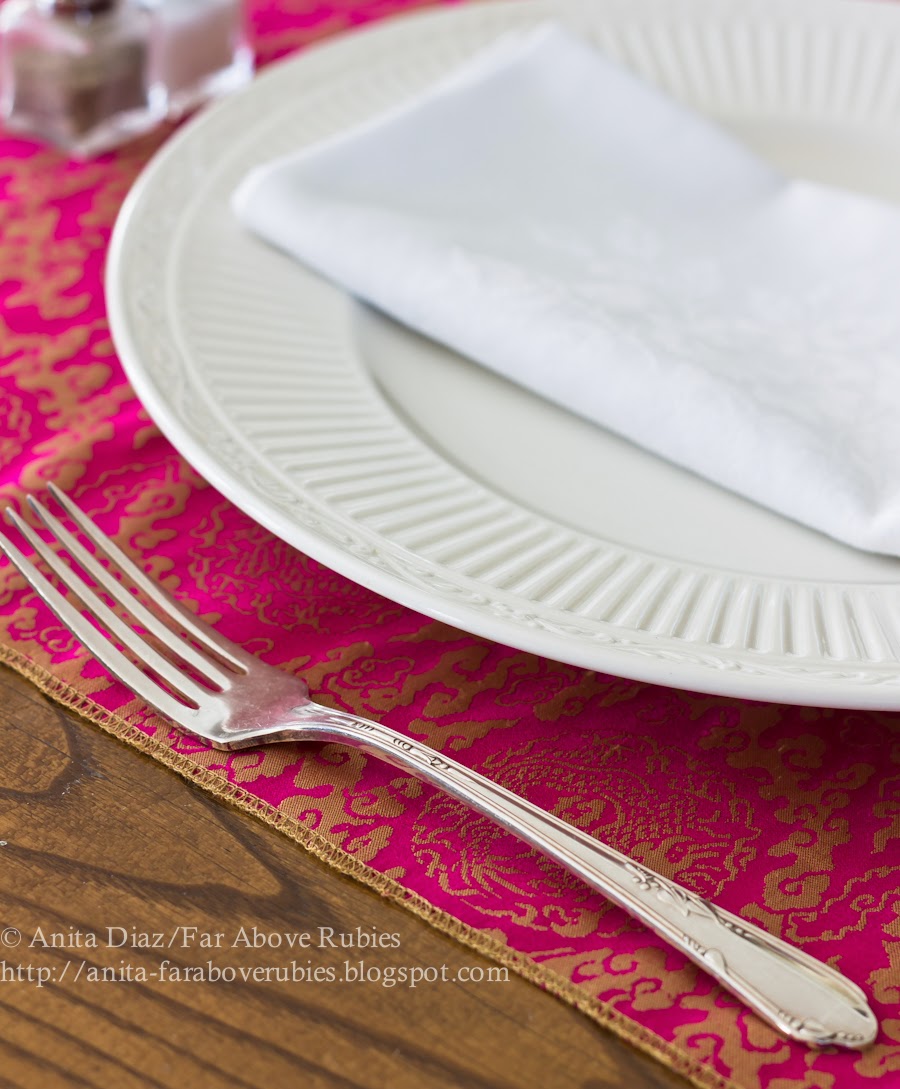I chose cream Mikasa “Italian Countryside” dinner plates to go with the pink runner I made from antique Chinese silk.