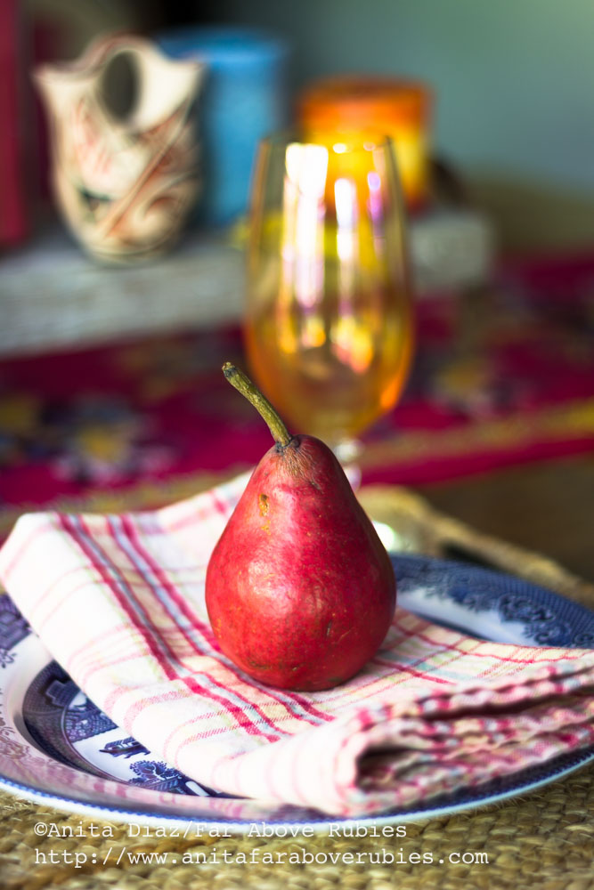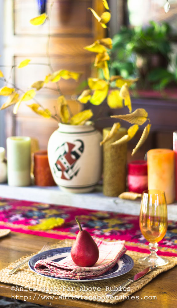 I’m loving the jute placemats from Walmart and the added layer of texture they bring to the table. A plaid napkin brings all the colors from the Blue Willow dinnerware, iridescent glassware and Indian silk runner together.