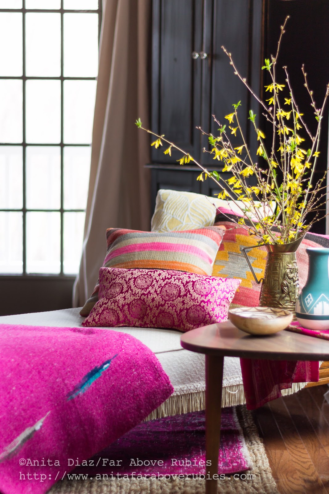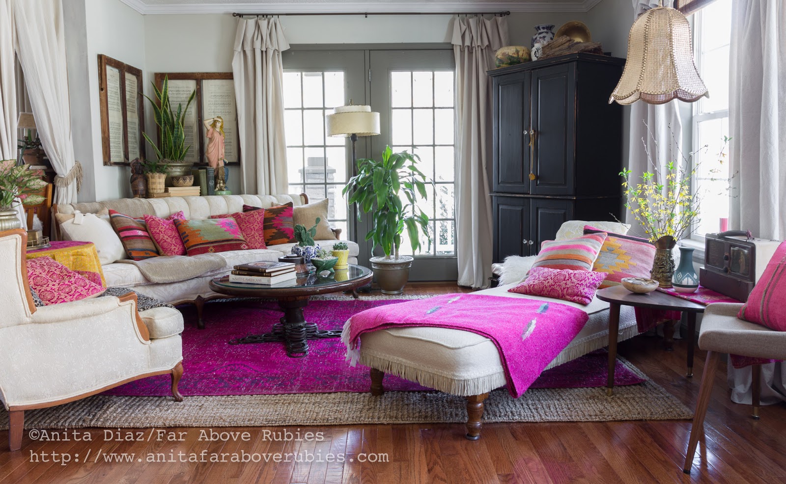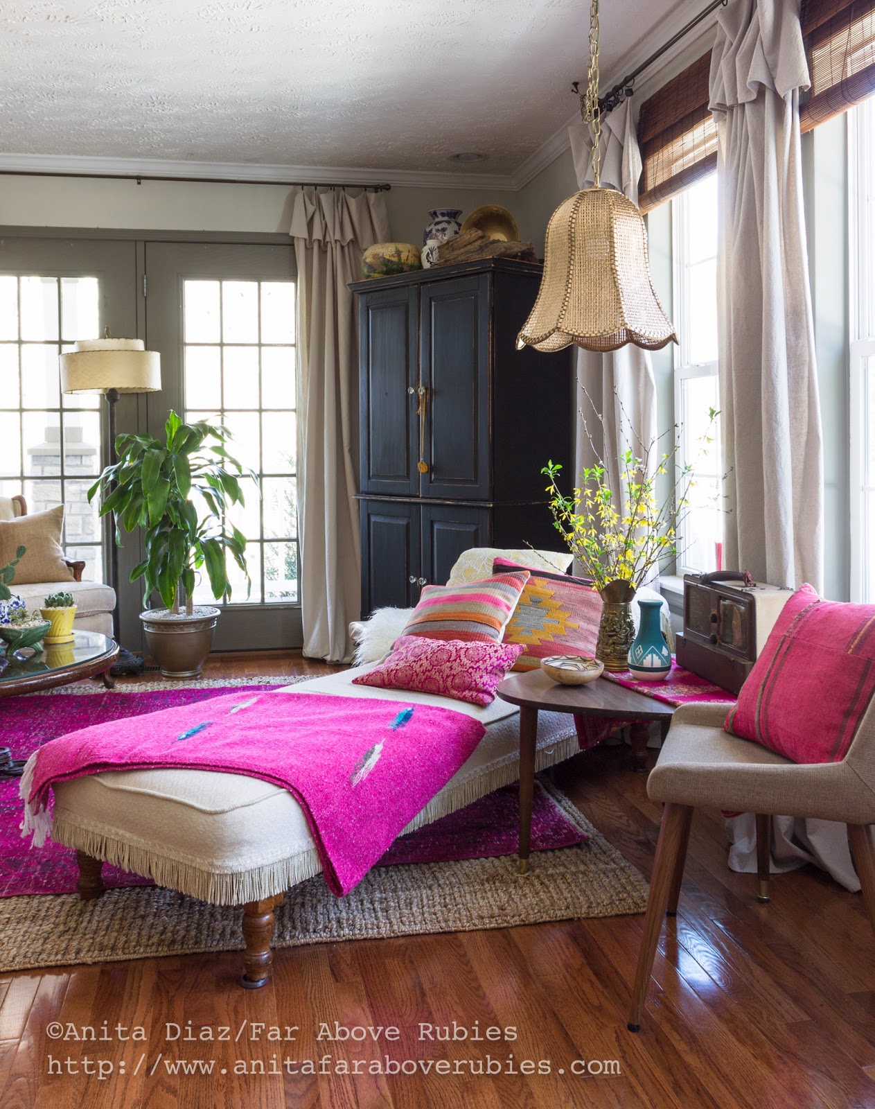 Obviously, I love pink these days. I also *love* my Turkish rugs, so I have layered a fuchsia overdyed Turkish rug, from the Unique Rug Store, over a jute rug so the size is big enough for the space. I love the look of layered rugs, and they really add texture and depth to the space.
