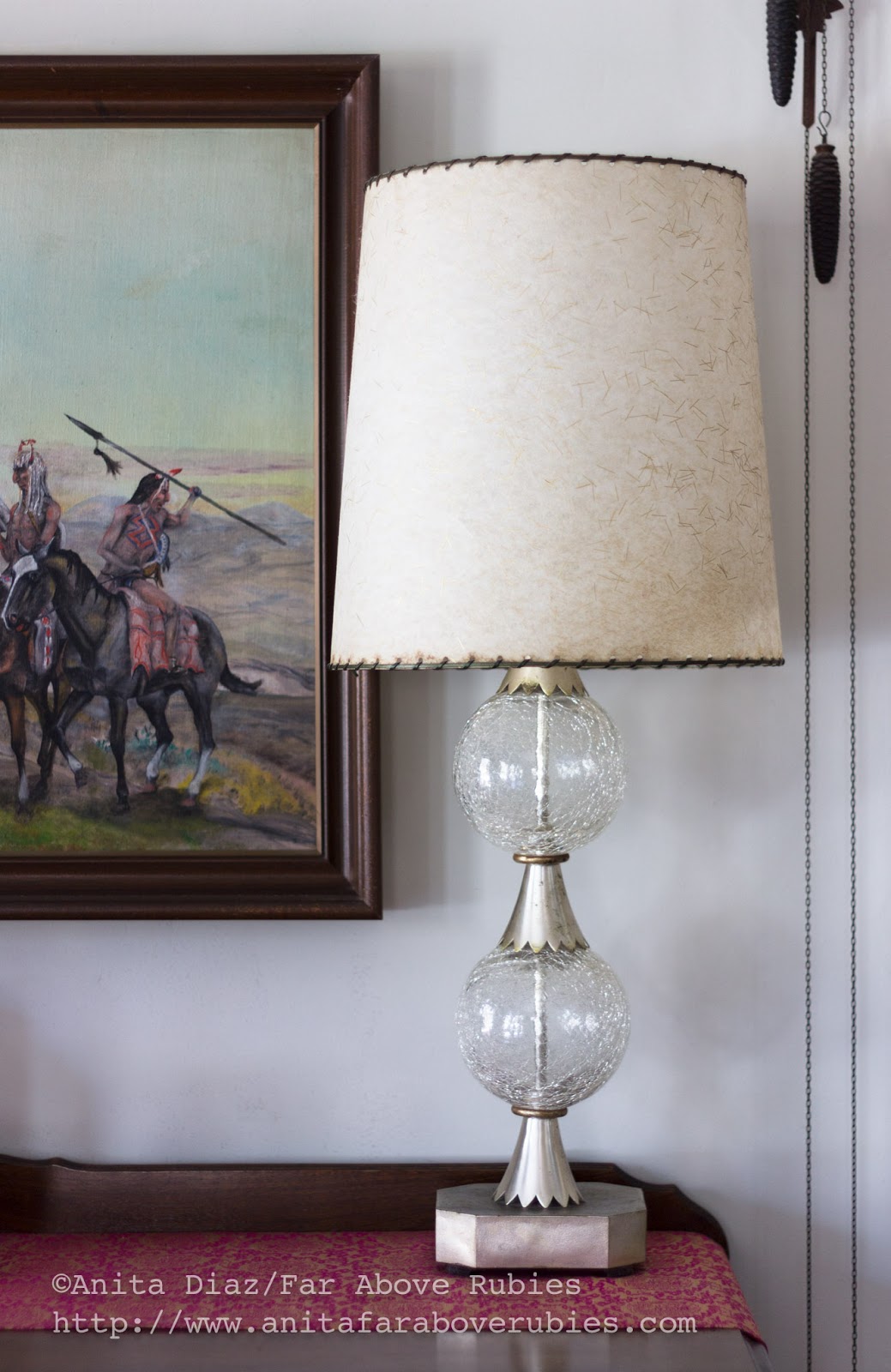 One of my favorite pieces is my great grandmother’s chaise lounge. I *always* find a place for it, and have “modernized” it a bit with kilim pillows and a Native Thunderbird pattern throw. I love furniture on the diagonal, and this arrangement works well with my grandmother’s mid-century modern guitar pick table and a new modern chair. The radio is from the 1940s and the one my dad remembers listening to Franklin D. Roosevelt’s funeral on as a child. The swag lamp is a recent recycle from the 1970s.