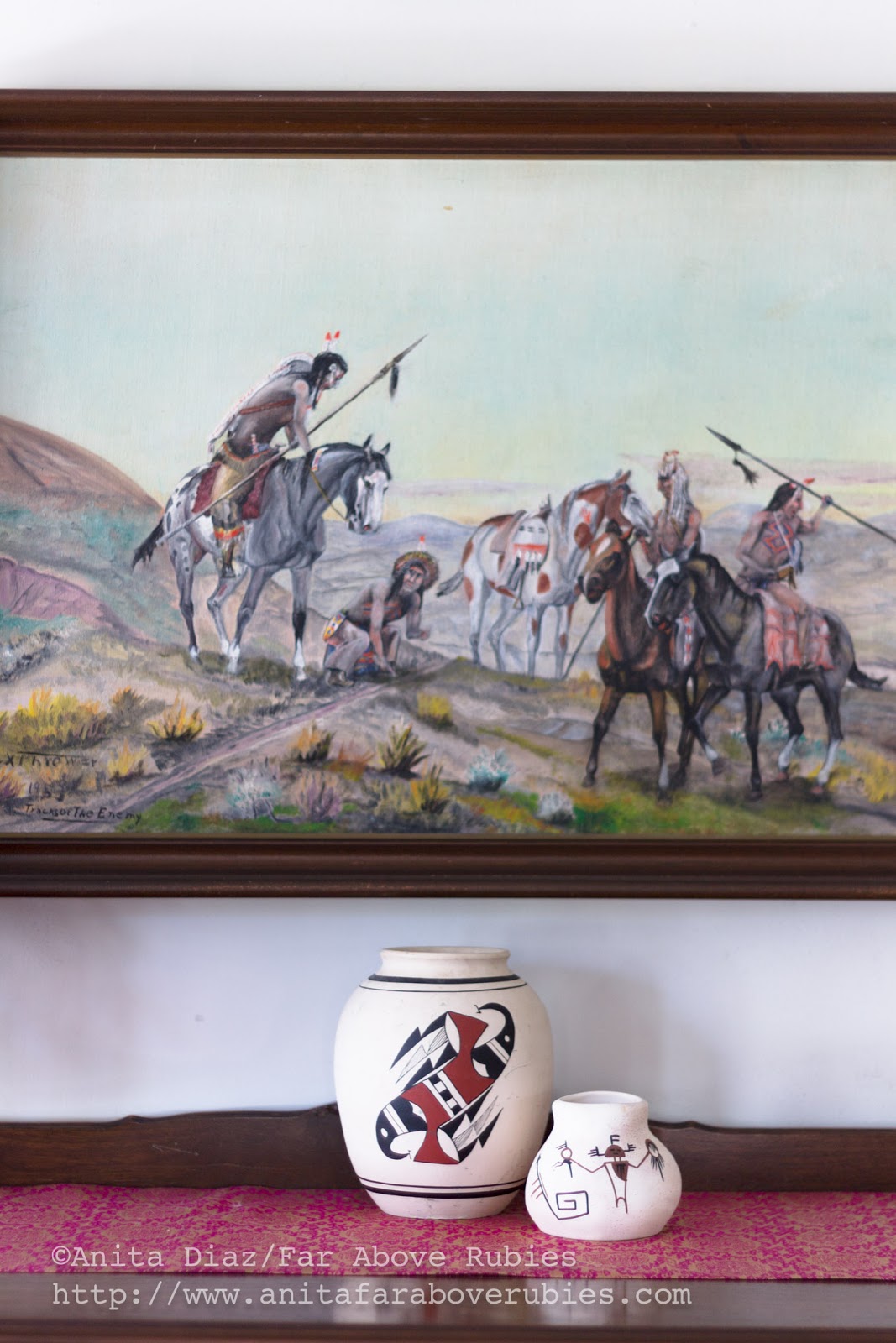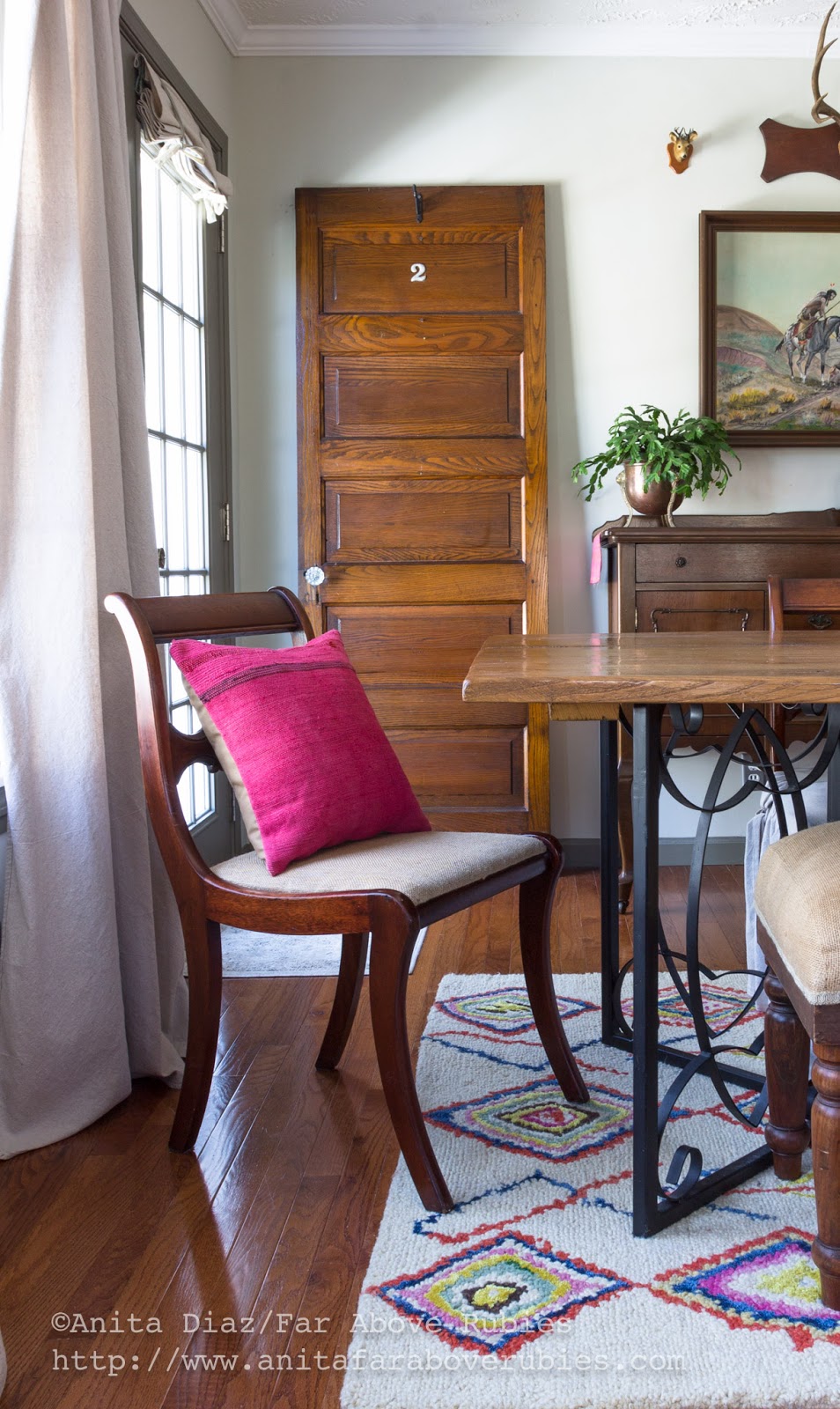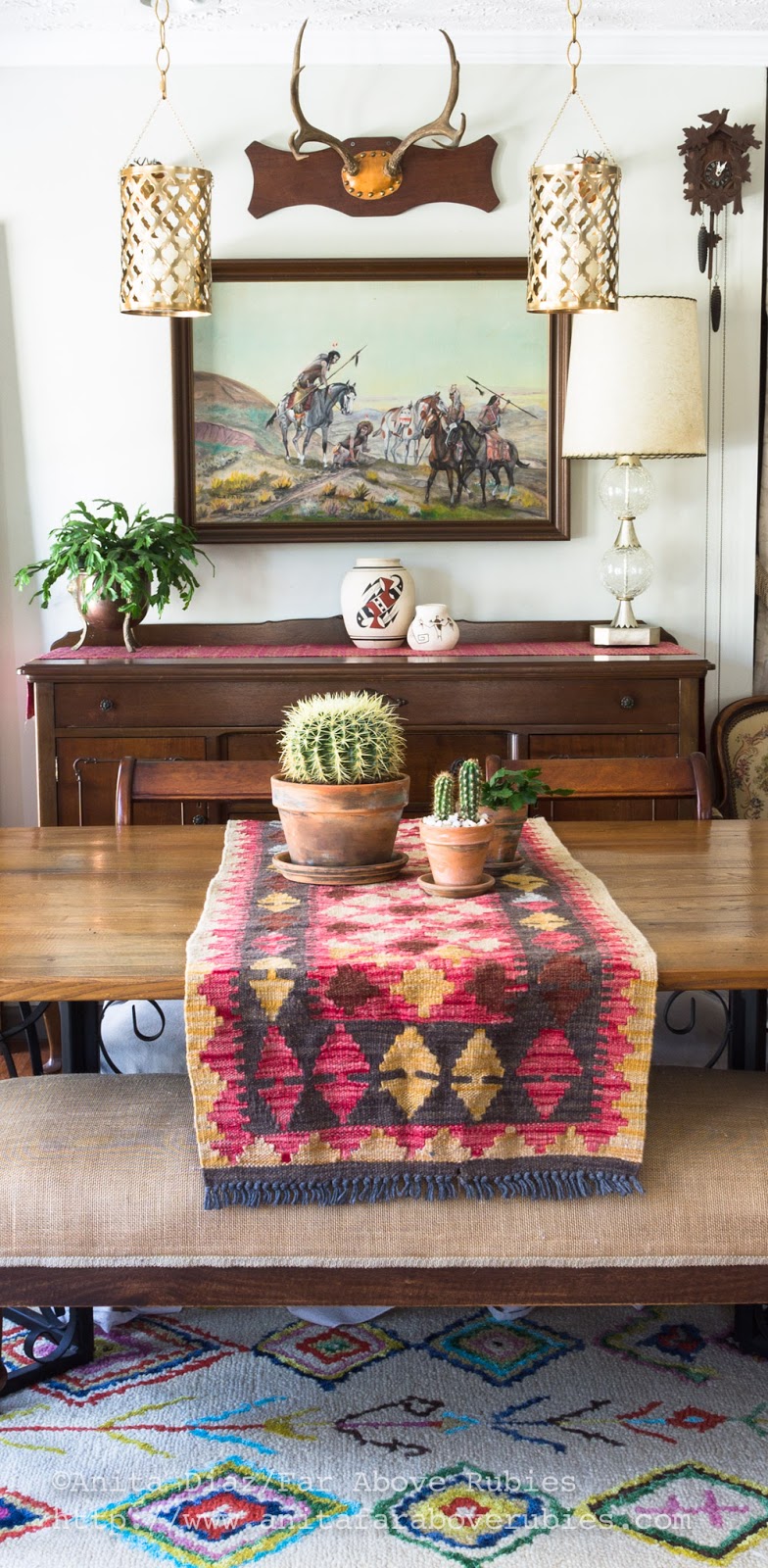 The dining area has seen a lot of changes over time. The mid-century painting by my late Montana uncle, was the foundation for this room, and more Native pottery, cacti and a kilim rug used as a runner, add texture.